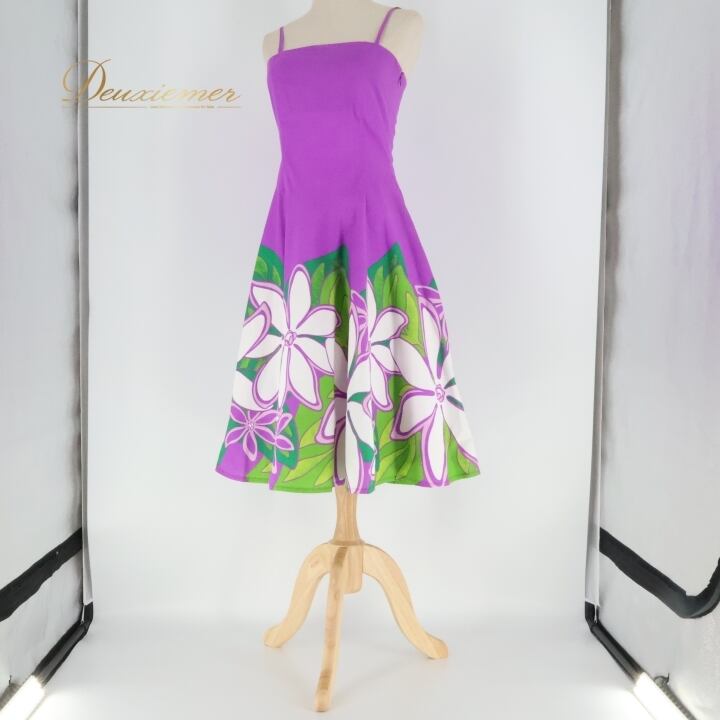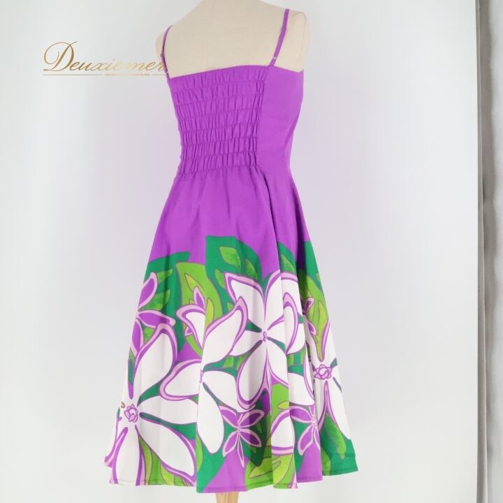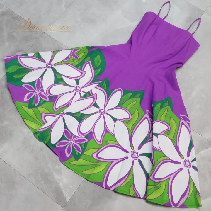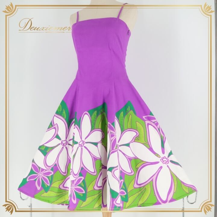 フラダンス 衣装 ワンピース ドレス セキノレーシングスポーツ パープル系 日本製 キャミソールドレス ティアレ柄 かわいい 華やか 鮮やか 明るい 紫 緑 白 ハワイアン アロハ ハワイアンプリント フラ ダンス レッスン 練習 レディース おしゃれ
