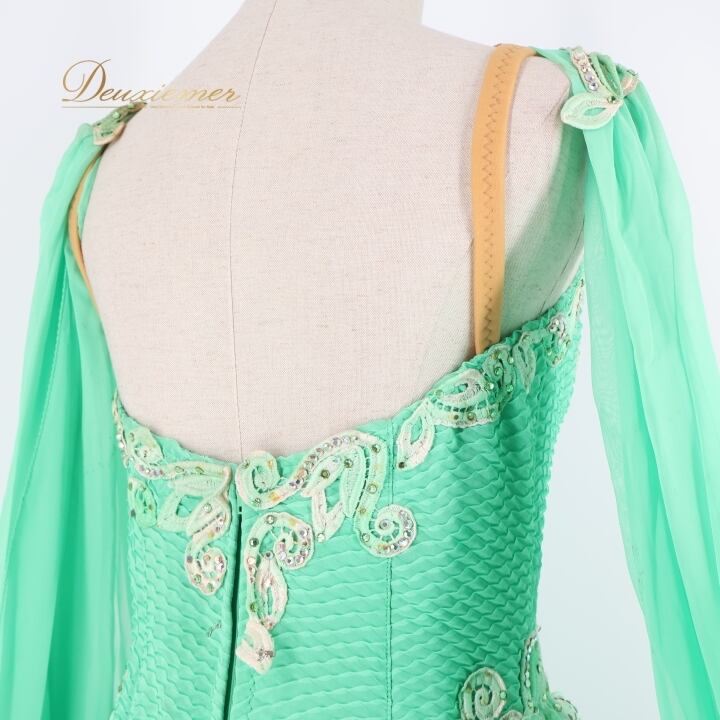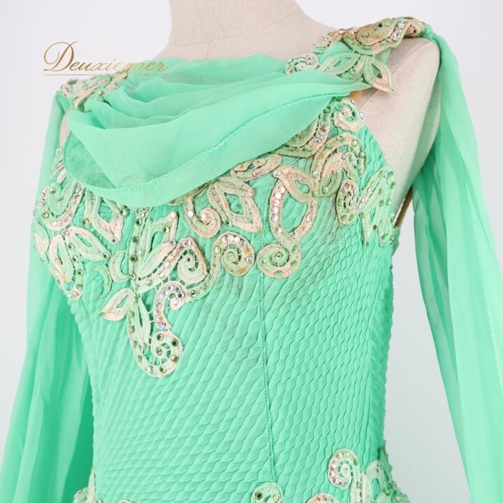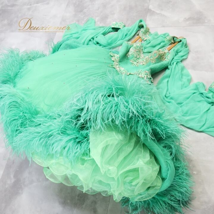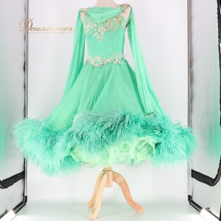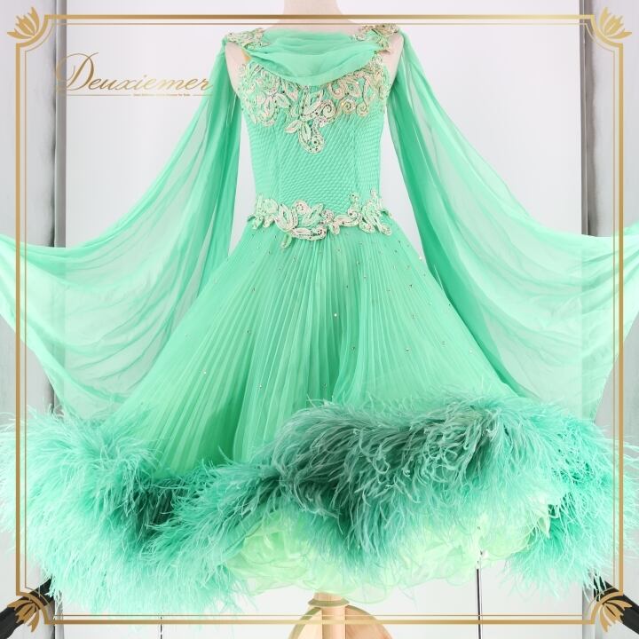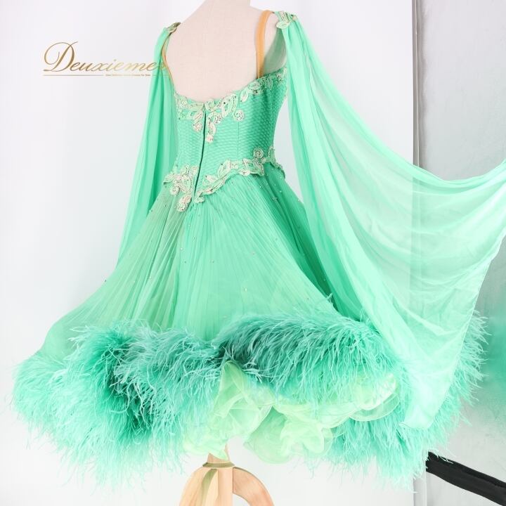 社交ダンス 衣装 スタンダードドレス ワンピース ドレス スタンダード ファー フリル エメラルドグリーン フロート レース ボリューム デモ 競技 ダンス パーティ lovely dancing 迫力 豪華 グリーン系 豪華なデザイン 大きなフロート ドレス ボリューム感 競技用衣装 パーティドレス フェミニン ステージ衣装 おしゃれ レディース ドレスアップ デモ用