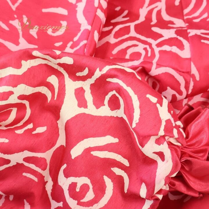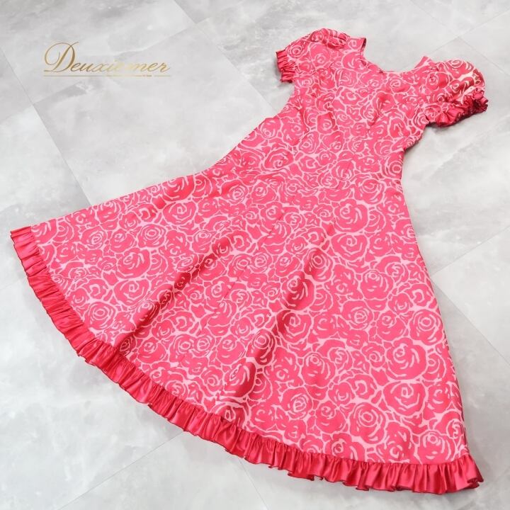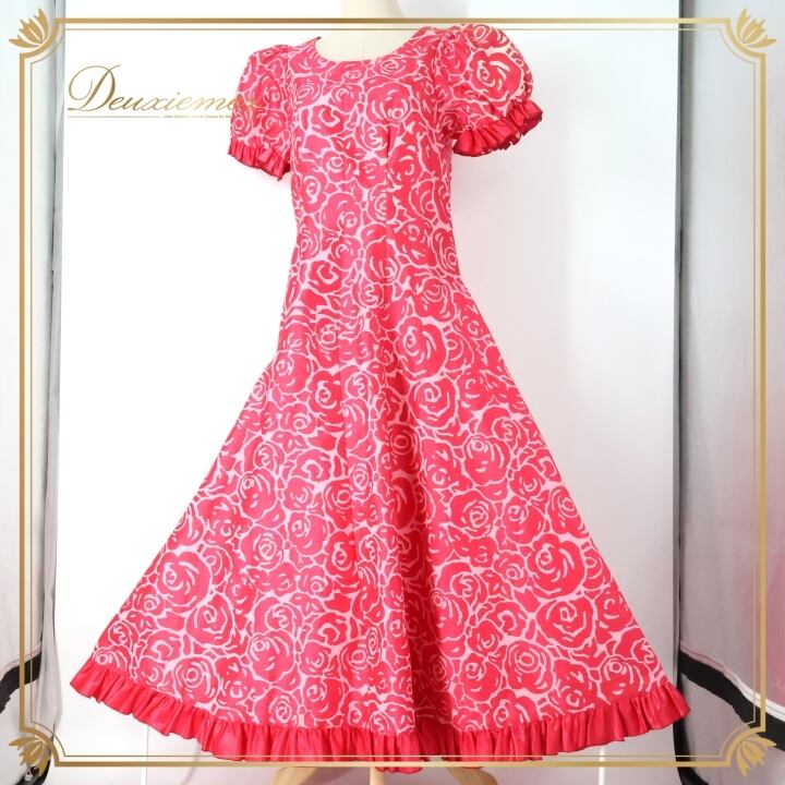 フラダンス 衣装 ワンピース ドレス ピンク系 バラ柄 ロケラニ柄 花柄 フラワープリント ハワイアン アロハ フラ ダンス レッスン 練習 フリル パフスリーブ 半袖 華やか 鮮やか かわいい おしゃれ 上品 フレアスカート ホワイト系 ピンク 白 サテン 光沢感 ハワイ風 カジュアル かわいいパーティー アクティブ フェミニン シンプル リゾート 薔薇プリント