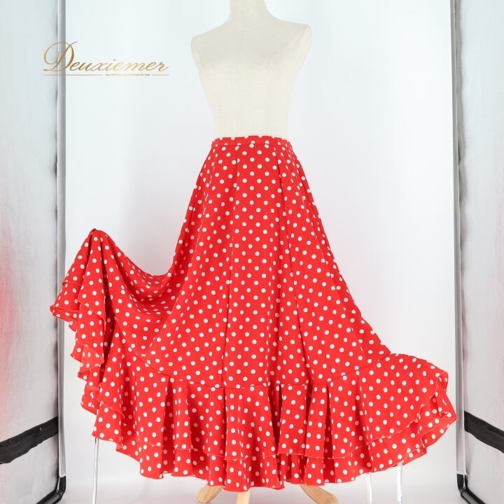 フラメンコ 衣装 ファルダ スカート 赤 水玉 白 ホワイト ボランテ フリル レッスン レトロ レッド系 ホワイト系 フレア スカート ダンス 衣装 レトロスタイル パーティ ファッション レディース フリル付き おしゃれ かわいい