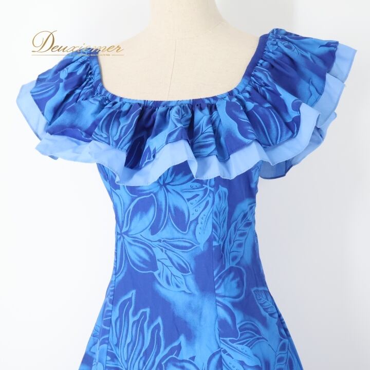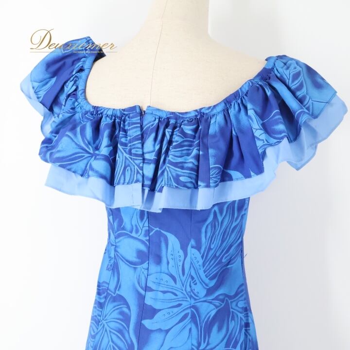 フラダンス 衣装 ワンピース ドレス ブルー系 CC Fashions ハワイ製 プルメリア柄 モンステラ柄 ハワイアンプリント アロハ フラ ダンス レッスン 練習 フリル 華やか 鮮やか さわやか 上品 かわいい おしゃれ 大人っぽい 青 水色 フラダンス用 トロピカル 美しい 夏 軽やか 柔らかい フェミニン