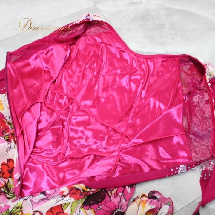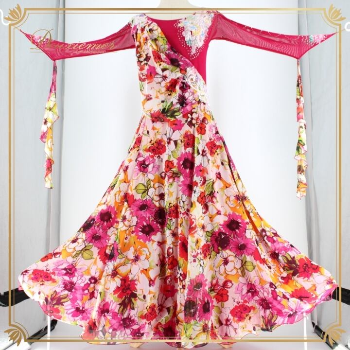 #社交ダンス #ダンス衣装 #レイリーナ #社交ダンスドレス #ドレス #マゼンダピンク #オレンジ #ホワイト #ライトグリーン #舞う #フロート付き #ラインストーン #シルエット #軽やか #Mサイズ #Lサイズ #ダンスファッション #二重スカート #華やか #パーティードレス #ENUTSU