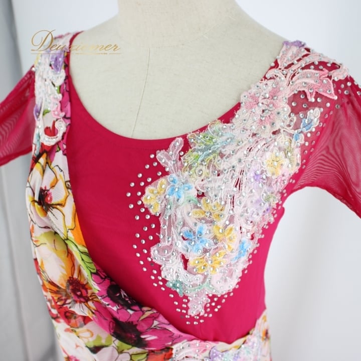 社交ダンス 衣装 スタンダード ドレス ワンピース パーティドレス Leirena レイリーナ ピンク系 ホワイト系 オレンジ系 グリーン系 花柄 フロート付きデザイン 二重スカート ラインストーン 伸縮性有り 軽やか 踊る用 衣装 レディース M Lサイズ カラフル ダンスパフォーマンス プロ仕様 おすすめ