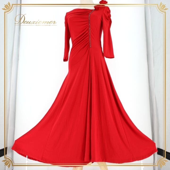 社交ダンス 衣装 スタンダード ドレス ワンピース レッスンウェア パーティドレス オールシーズン 赤 レッド系 ラインストーン 派手 シンプル 鮮やか フレア ドレープ エレガント カジュアル 大人 レディース フォーマル おしゃれ 着やすい 薄手 伸縮性 おもてなし ダンスパーティー マッチング 着替え 快適