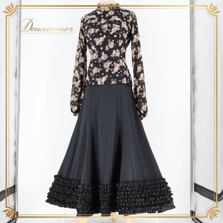 フラメンコ 衣装 マンサニージャ LOPEZ DE SANTOS ロペスデサントス Manzanilla トップス ブラウス ブラック系 ゴールド系 ファルダ スカート ツーピース セットアップ 長袖 ダンス 発表会 ボランテ フリル 黒 マンサニージャ 衣装 上品 軽い生地 リボン 踊り用衣装 フェスティバル 舞台用演出 大人用 ダンスウェア レディース
