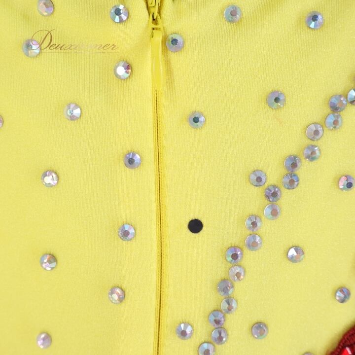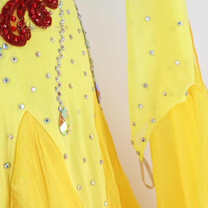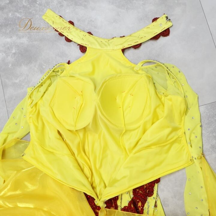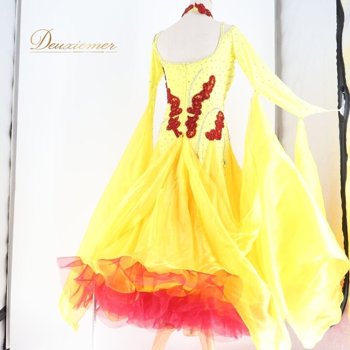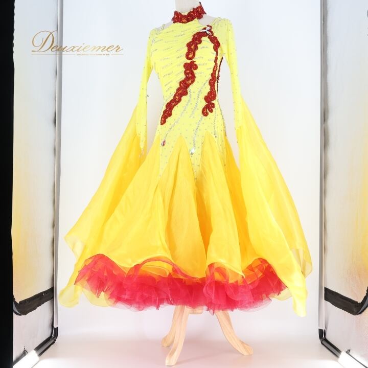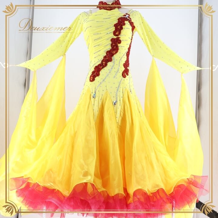 社交ダンス 衣装 スタンダードドレス ワンピース ドレス 黄色 フリル レース デモ 競技 ダンス パーティ 発表会 フロート 豪華 華やか 赤 ワインレッド イエロー系 レッド系 鮮やか フロート付き エレガント 舞台衣装 ダンス発表会 コンペティション