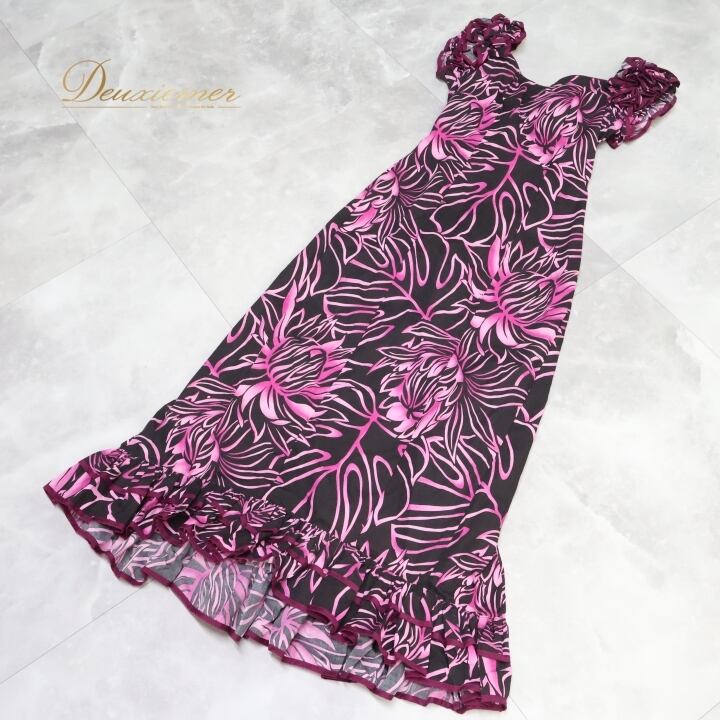 フラダンス 衣装 ワンピース ドレス ブラック系 CC Fashions ハワイ製 モンステラ柄 ハワイアンプリント アロハ フラ ダンス レッスン 練習 花柄 植物柄 フラワープリント フリル グラデーション 華やか 鮮やか かわいい おしゃれ 上品 大人っぽい ピンク系 パープル系 黒 ピンク 紫 フラダンス衣装 モンステラ レディース リゾート かわいいデザイン