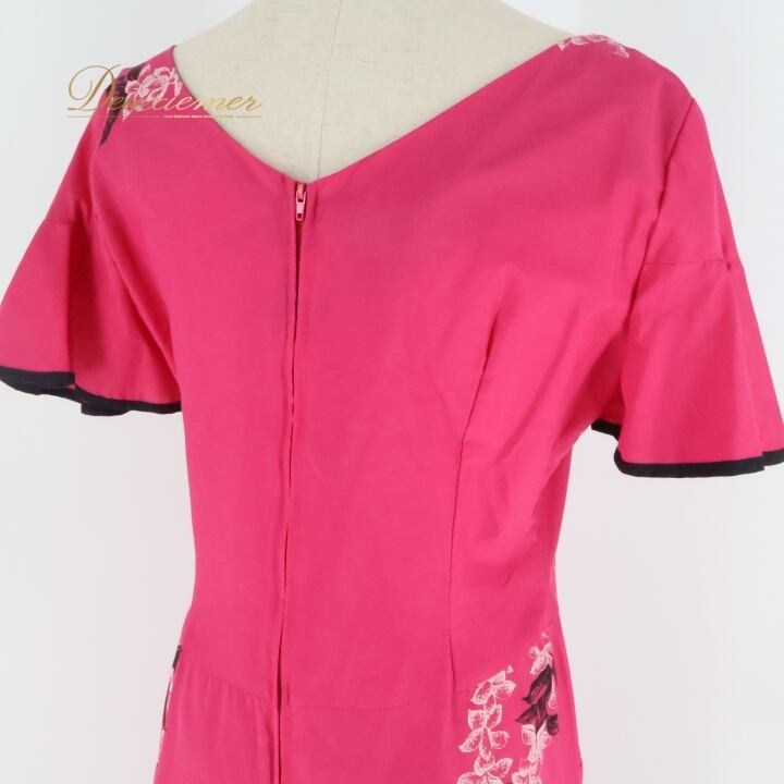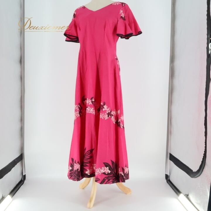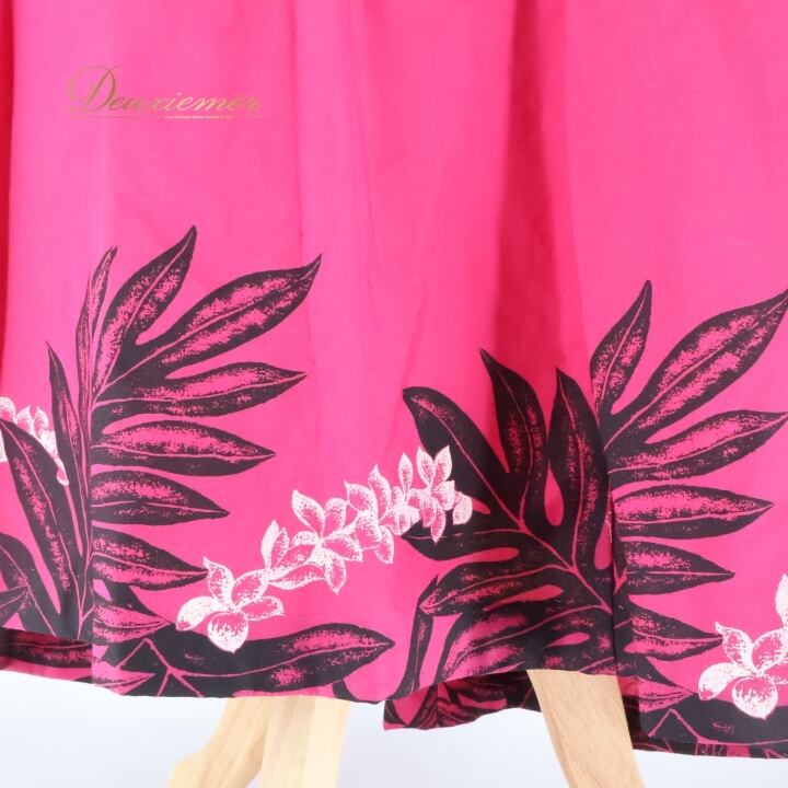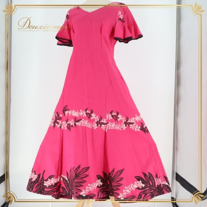 フラダンス 衣装 ワンピース ドレス ムームーファクトリー ピンク系 T&L MUUMUU FACTORY ハワイ製 シンプル プルメリア柄 かわいい 華やか 鮮やか 明るい 黒 ハワイアン アロハ ハワイアンプリント フラ ダンス レッスン 練習 おしゃれ