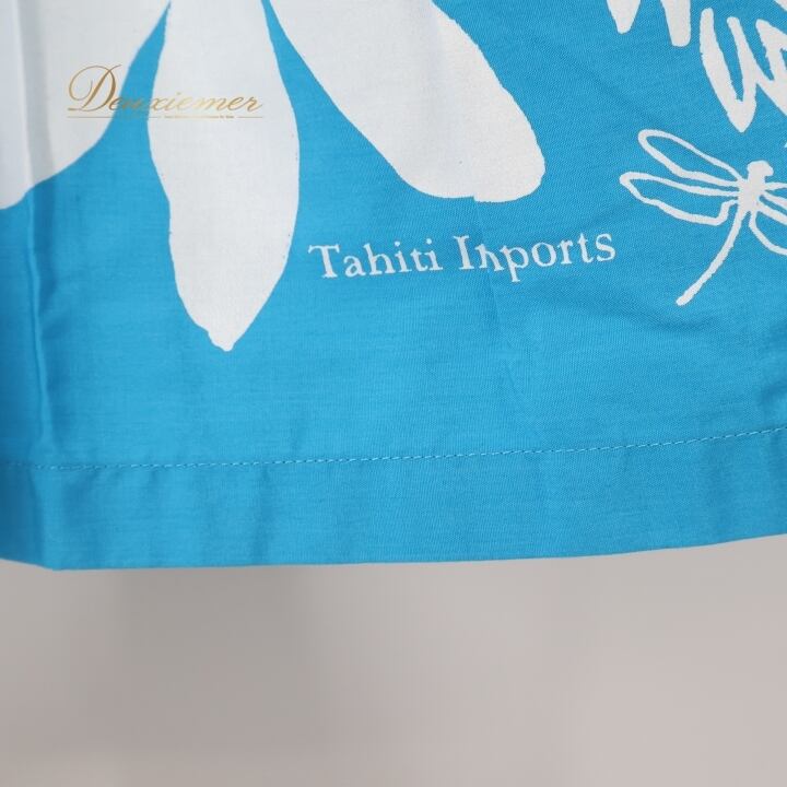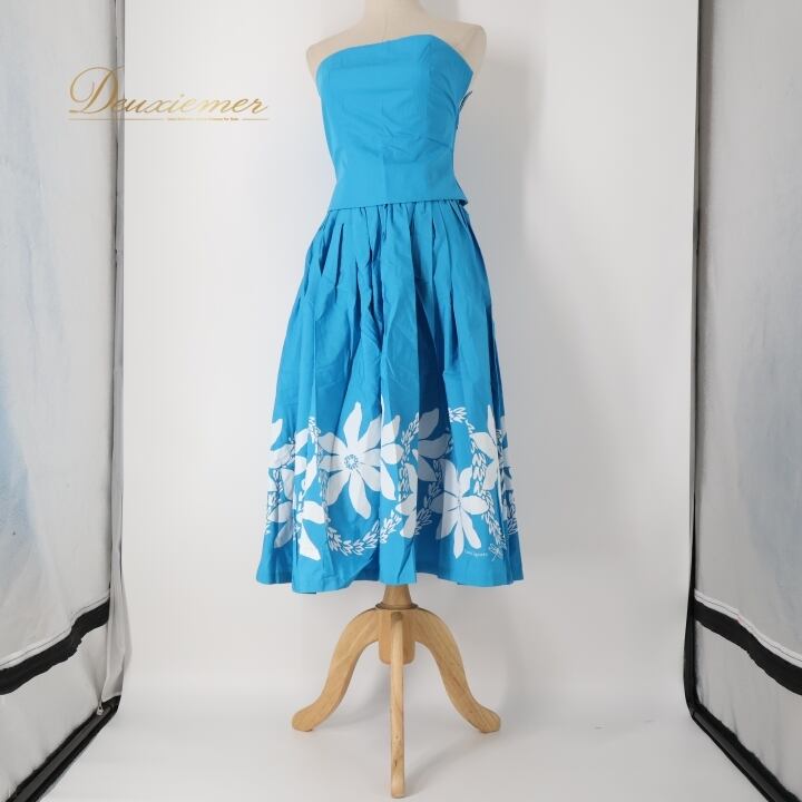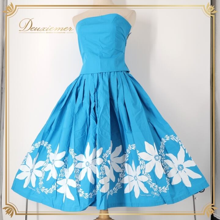 フラダンス 衣装 ツーピース セットアップ 上下セット ブルー系 タヒチインポーツ ティアレ柄 ハワイアンプリント TAHITI IMPORTS アロハ フラ ダンス レッスン 練習 花柄 植物柄 華やか かわいい おしゃれ 鮮やか さわやか 上品 ホワイト系 水色 白 リゾート スタイリッシュ 女性用 スカートセット