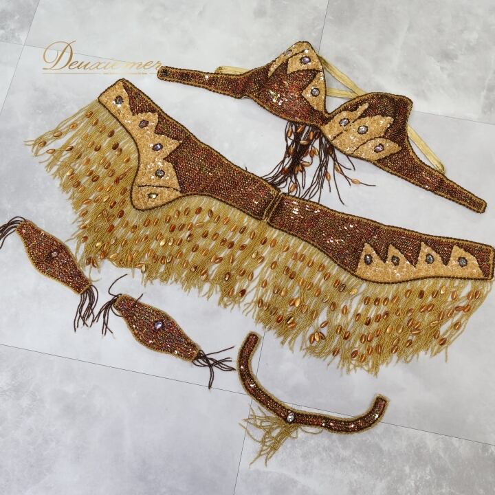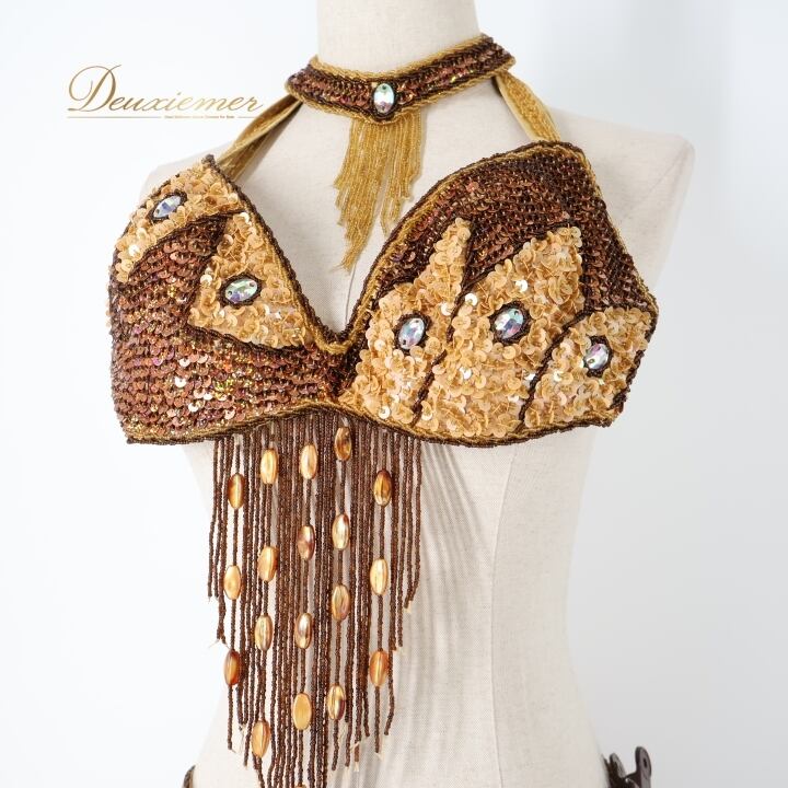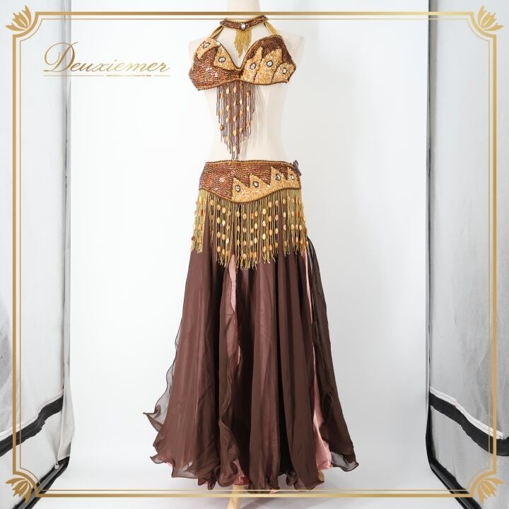 ベリーダンス オリエンタル 衣装 上下セット ブラウン系 トップス スカート チョーカー ベール アーム アーム飾り 茶 金 ラインストーン ビーズ フリンジ 透け感 豪華 装飾 華やか セット ダンス衣装 ステージ イベント ピンク系 ゴールド系
