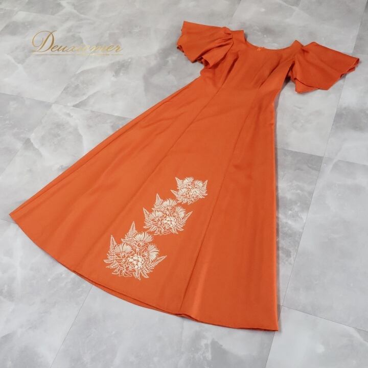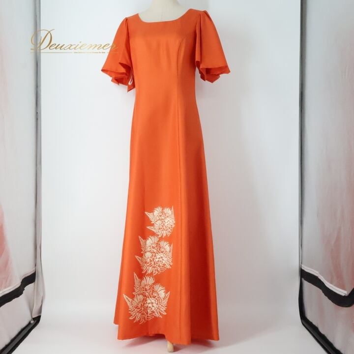 #フラダンス #衣装 #ワンピース #ドレス #Lサイズ #日本製 #ALOHA #ハワイアンプリント #オレンジ #ファスナー #ポリエステル #ダンス衣装 #エレガント #夏ファッション #ハワイアンスタイル #トルソー #おしゃれ #アロハスタンダード #フラ #ENUTSU