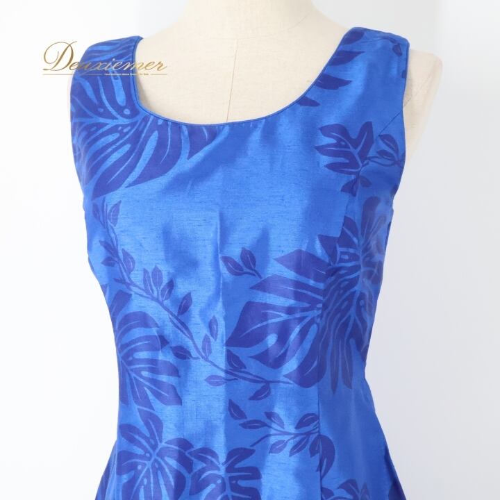 フラダンス 衣装 ワンピース ドレス ブルー系 メネフネプランテーション 日本製 モンステラ柄 ハワイアンプリント MENEHUNE PLANTETION 植物柄 アロハ フラ ダンス レッスン 練習 ノースリーブ 華やか 鮮やか 大人っぽい 上品 かわいい おしゃれ ネイビー系 青 紺 衣装スタイル フェスティバル リゾート レディース かわいいデザイン フラダンス用