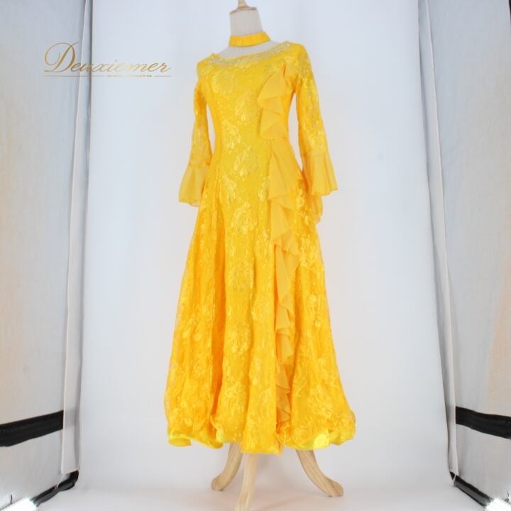 社交ダンス 衣装 スタンダード ドレス ワンピース パーティドレス prima boutique プリマブティック 黄色 花柄 長袖 イエロー系 鮮やか 存在感 ラインストーン レース フォーマル おしゃれ ダンス衣装 結婚式 祭典 服装 女性用 体型カバー セクシー フリル