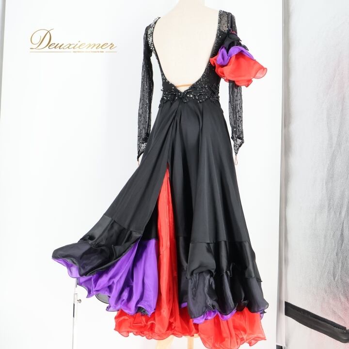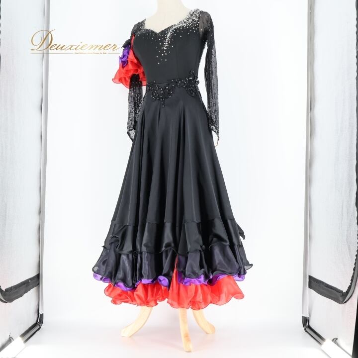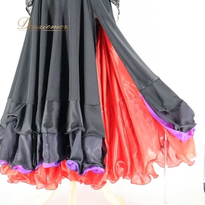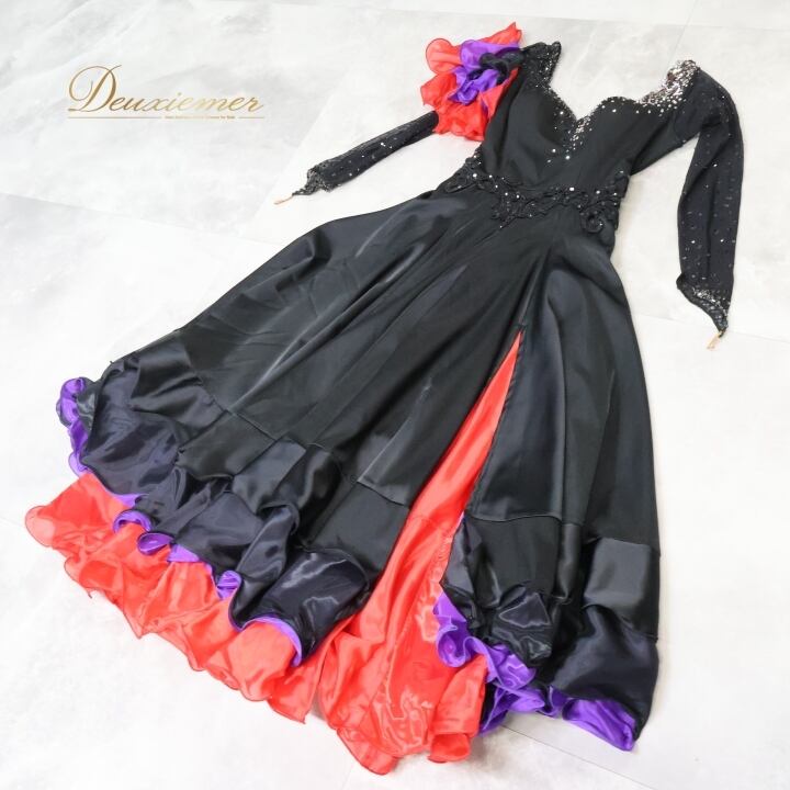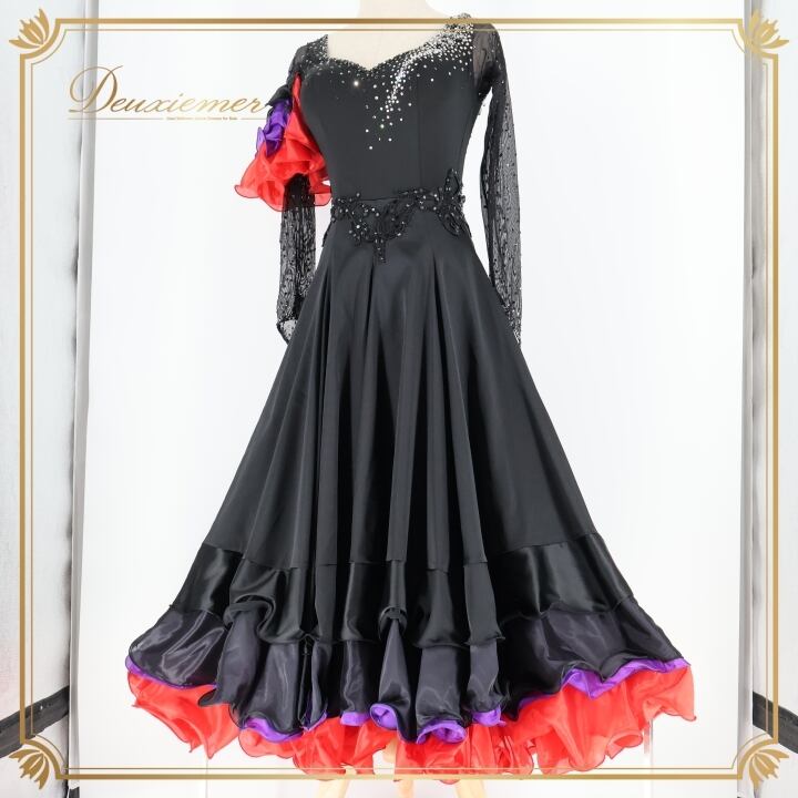 社交ダンス 衣装 スタンダードドレス ワンピース ドレス スタンダード 黒 赤 レース フリル 紫 デモ 競技 ダンス パーティ 発表会 ブラック系 レッド系 フレアスカート 大人用 おしゃれ デザイン パーティー用 スポーツ衣装 コスチューム 舞台衣装 ダンス衣装 競技用 エレガント