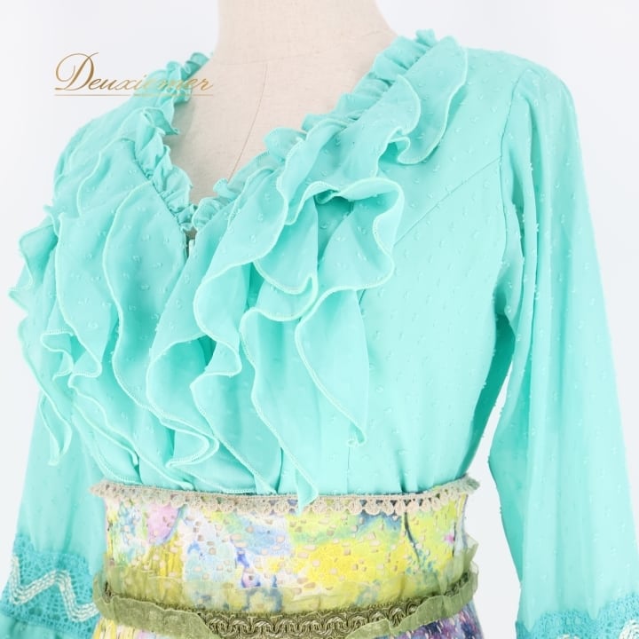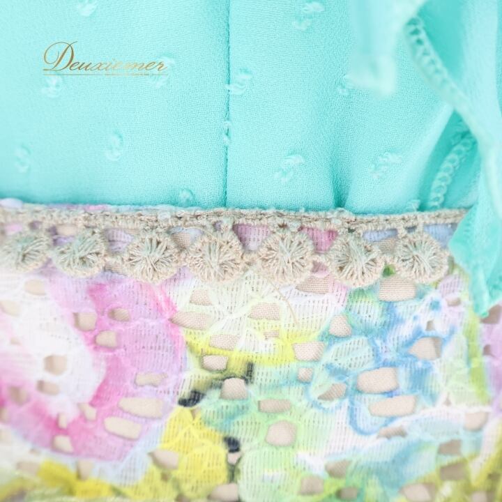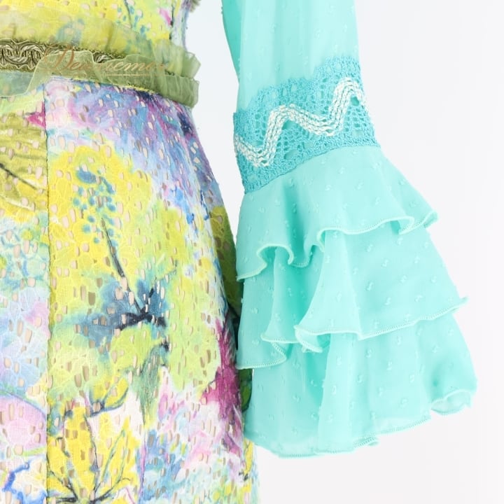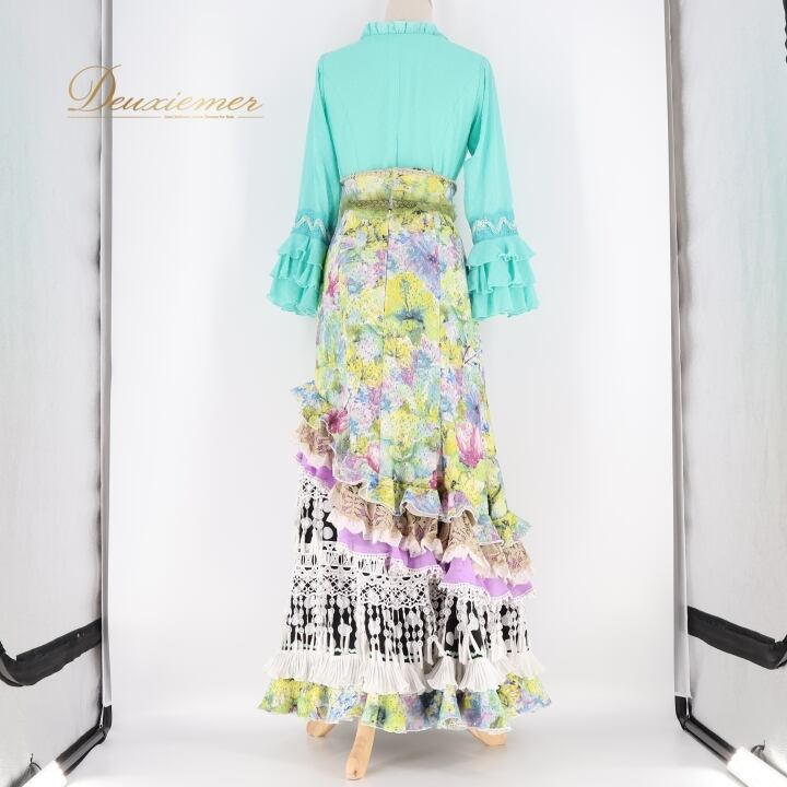 フラメンコ 衣装 ソニアジョーンズ SONIA JOHNES ツーピース セットアップ ファルダ スカート トップス ブラウス ボランテ フリル レース 花柄 ハイウエスト ミント 明るい 水玉 ドット ブルー系 グリーン系 ピンク系 パープル系 可愛い デザイン おしゃれ ダンス 衣装 カラフル ツーピースセット 装飾 レディース 踊り