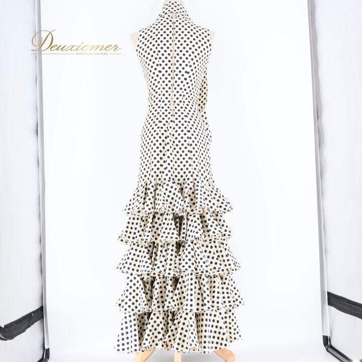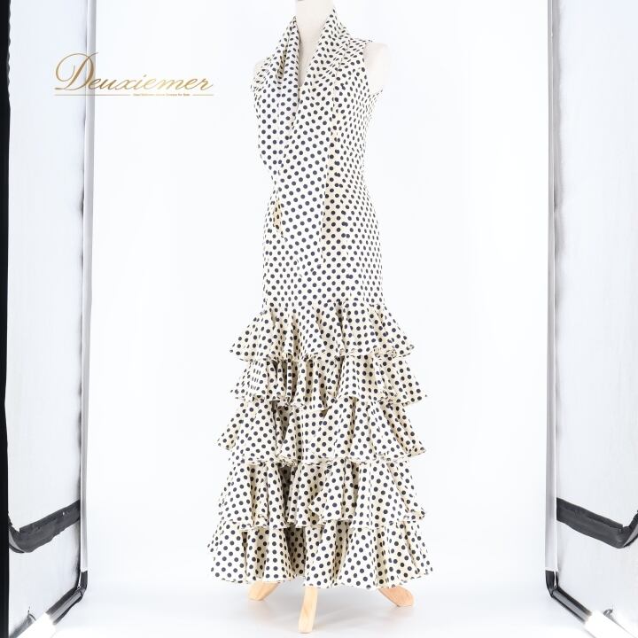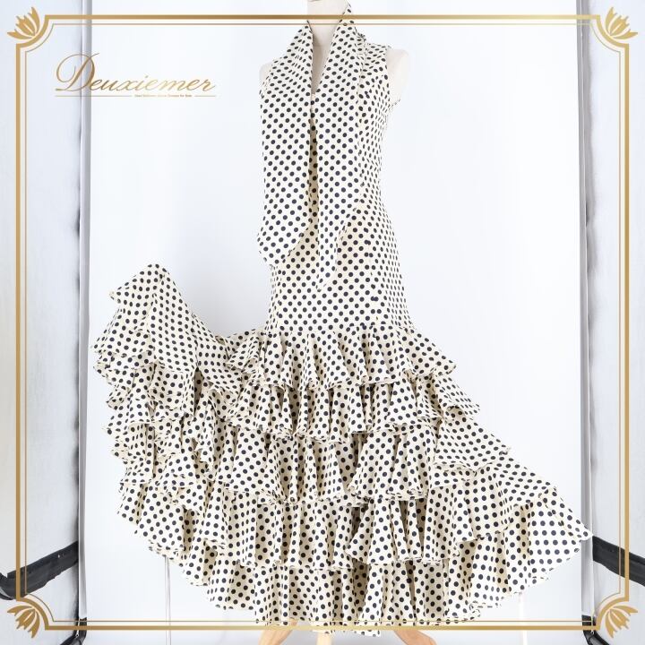 フラメンコ 衣装 ワンピース ドレス 水玉 ドット フリル ボウタイ オフホワイト ダンス 舞台 パーティ 発表会 レトロ 黒 ブラック系 ホワイト系 フラメンコドレス ダンス衣装 ステージ衣装 パーティドレス おしゃれ 結婚式 かわいい フリルデザイン レトロドット コスチューム 大人可愛い 華やか フェスティバル