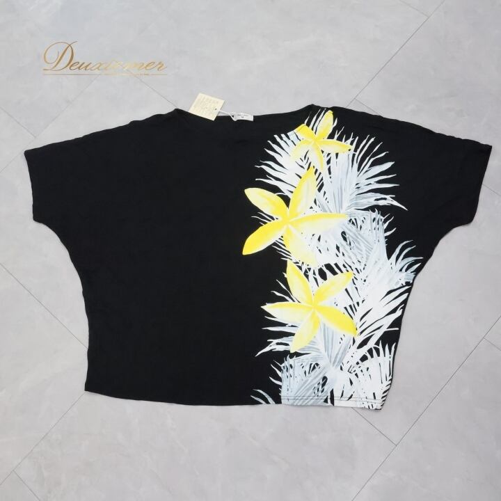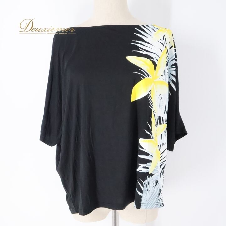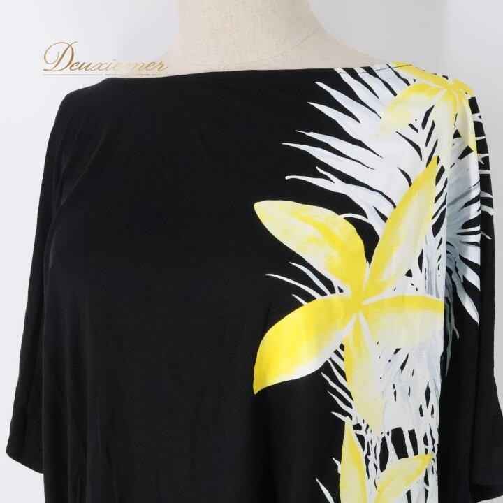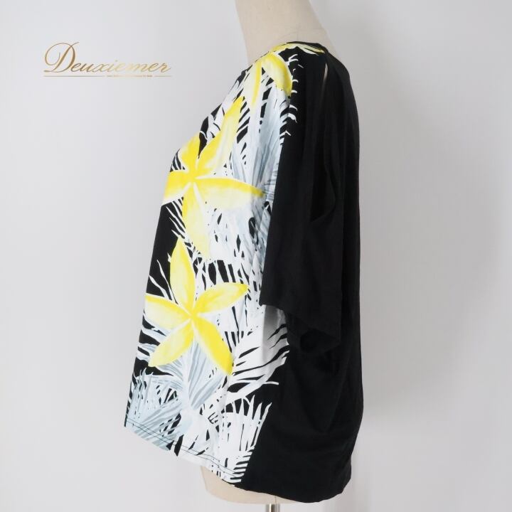 フラダンス 衣装 トップス ブラック系 マウナロア ハワイアンプリント ティアレ柄 Maunaloa アロハ フラ ダンス レッスン 練習 ドルマンスリーブ 華やか かわいい おしゃれ カットソー 五分袖 イエロー系 ホワイト系 黒 黄 白 ドルマン ブラック ホワイト イエロー カジュアル スポーツ コーディネート トロピカル レディース シンプル ファッション