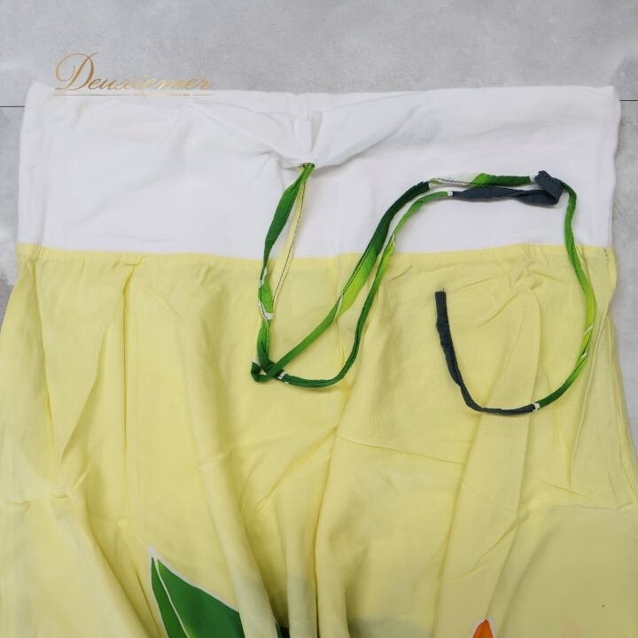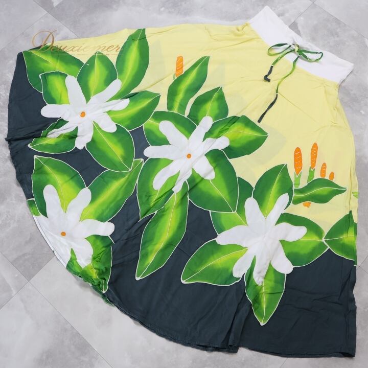 フラダンス 衣装 スカート PUKANA イエロー系 シングル アシンメトリー ティアレ柄 かわいい 華やか 鮮やか 明るい カラフル 黄 緑 白 黒 ハワイアン アロハ ハワイアンプリント フラ ダンス レッスン 練習 おしゃれ さわやか