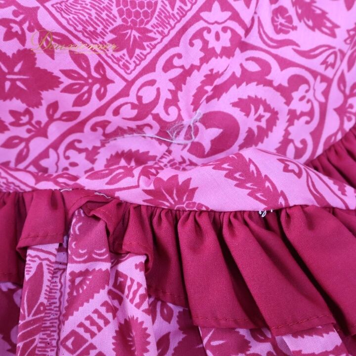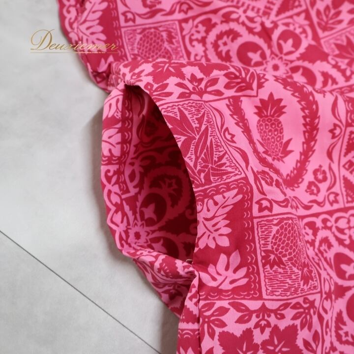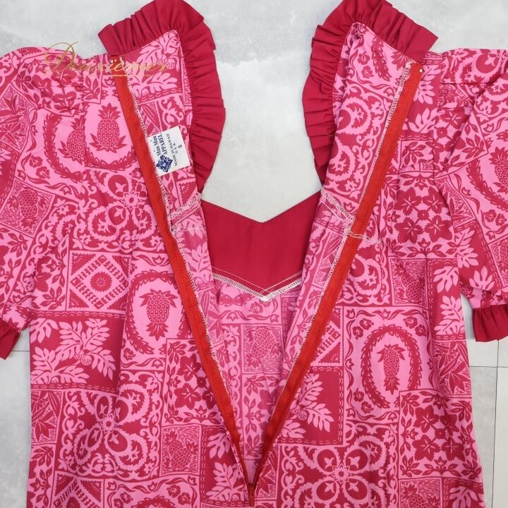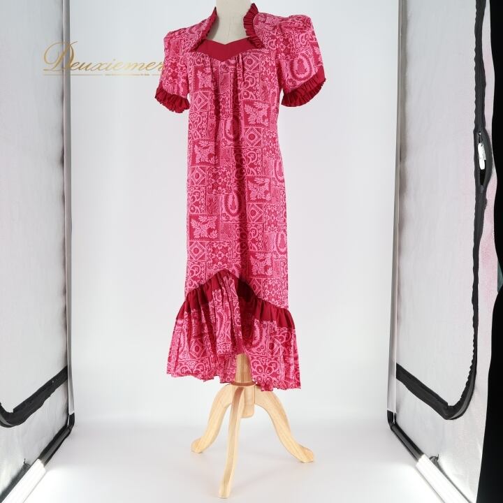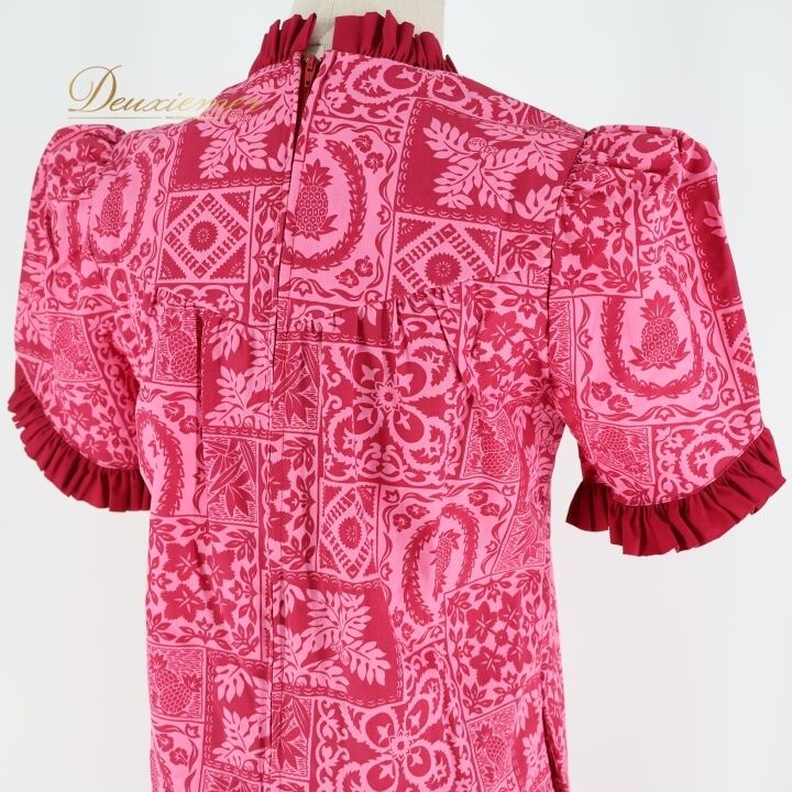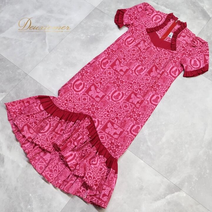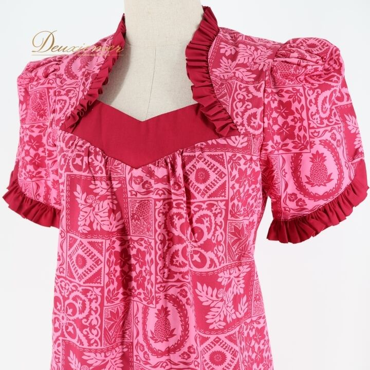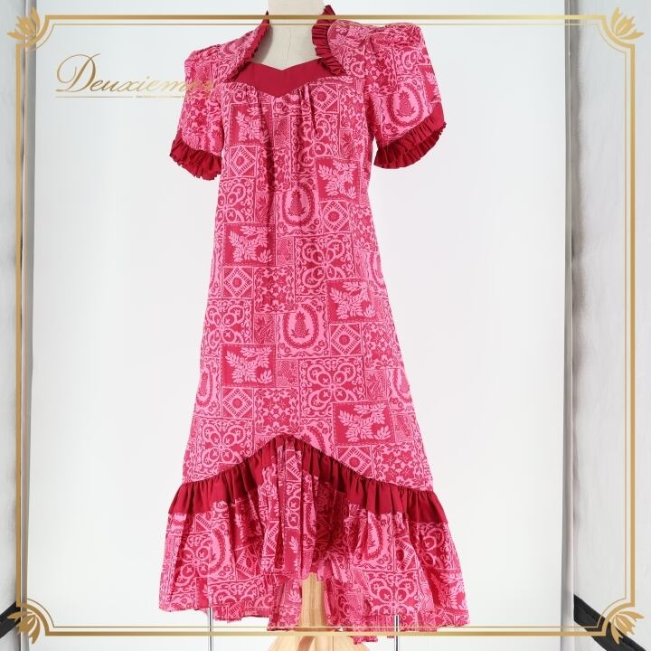 フラダンス 衣装 ワンピース ドレス Muu Muu APPAREL ピンク系 ハワイ製 フリル アシンメトリー パフスリーブ ポケット付き ワントーン かわいい 華やか 鮮やか 明るい ハワイアン アロハ ハワイアンプリント フラ ダンス レッスン 練習