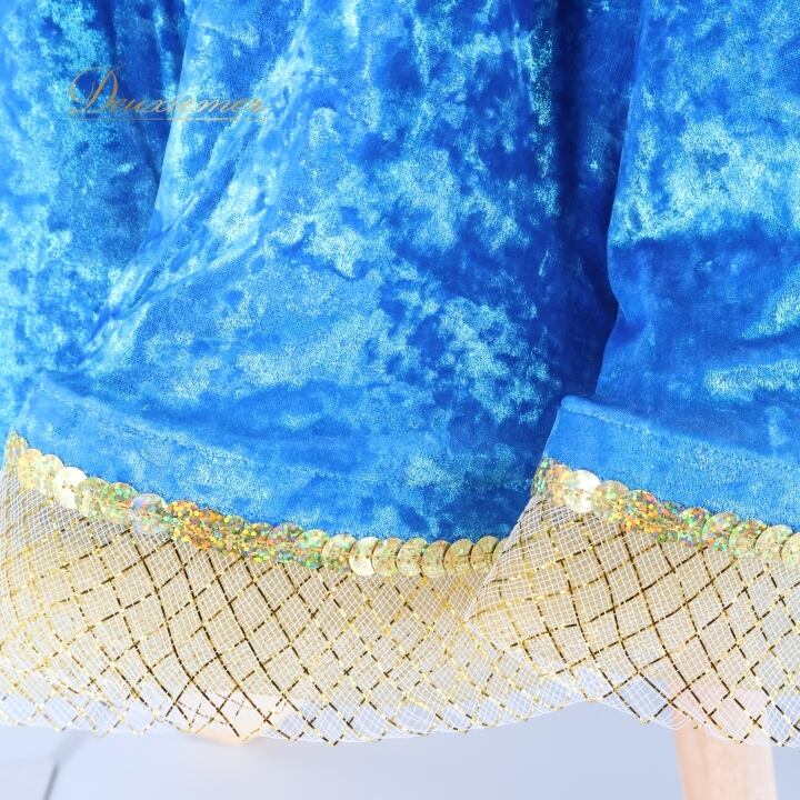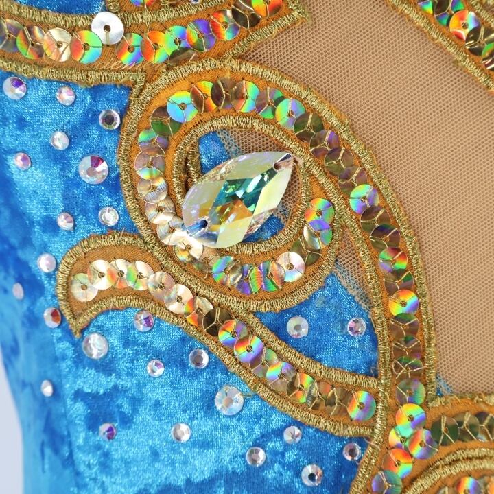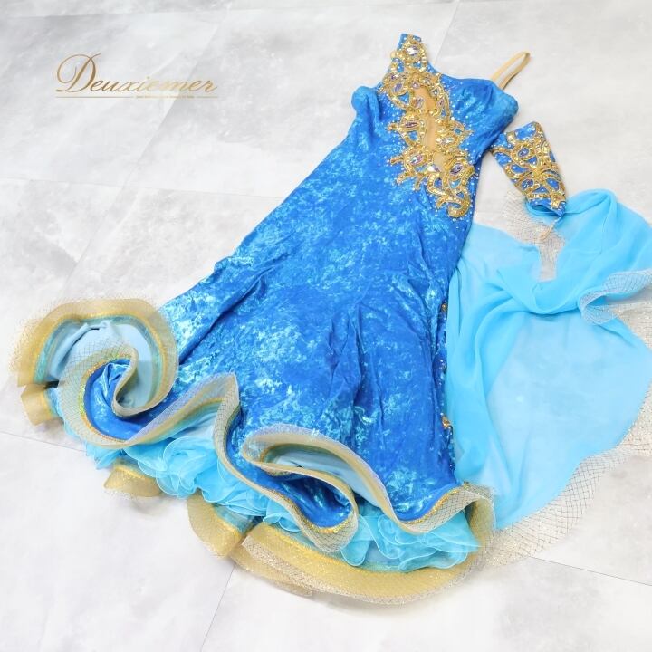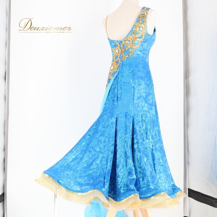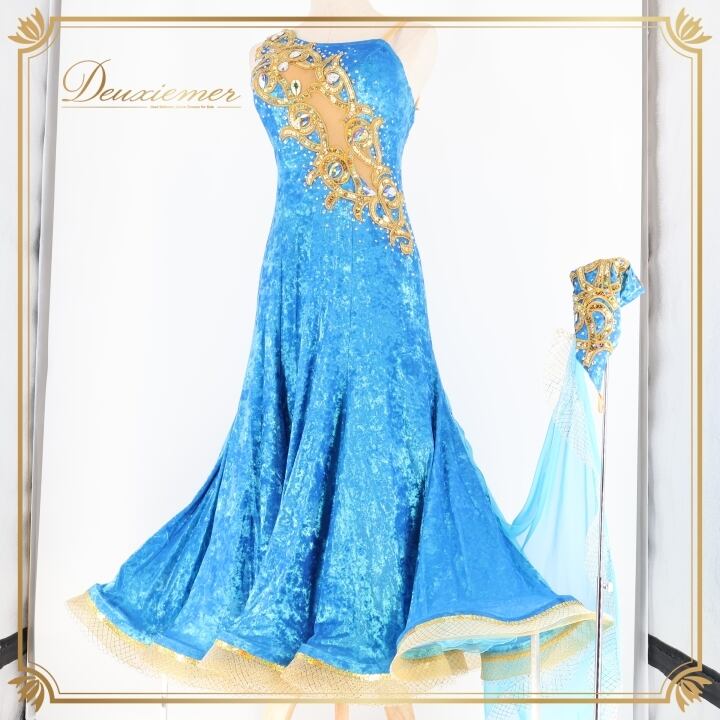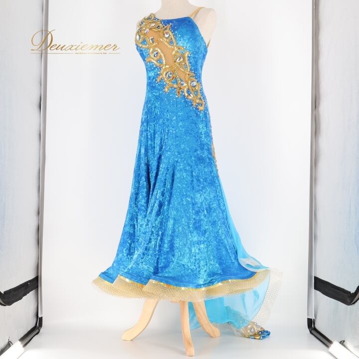 社交ダンス 衣装 スタンダードドレス ワンピース スタンダード 青 ベロア HISAYA ヒサヤ フロート レース 金 デモ 競技 ダンス パーティ 発表会 ブルー系 ゴールド系 鮮やか ダンス衣装 フェスティバル用 発表会用 コスチューム おしゃれ フォーマル ステージ衣装