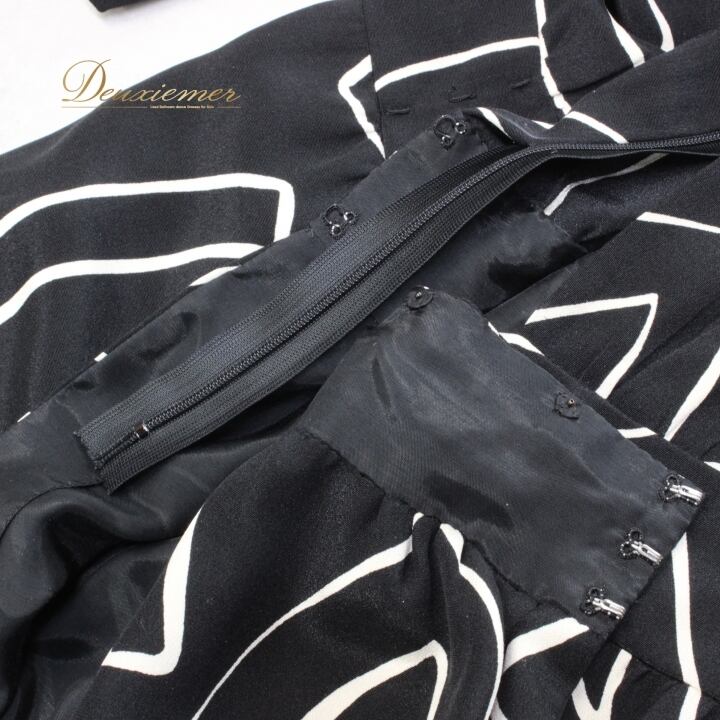 背中ファスナーと腰辺りでボタン・フックを留めて着用するデザインです。