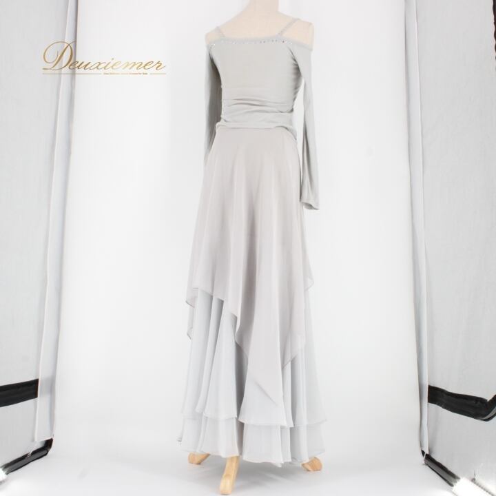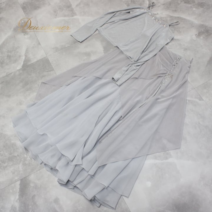 社交ダンス 衣装 スタンダード 上下セット ツーピース レッスンウェア パーティ衣装 Create-Sun クリエイトサン ラインストーン グレイ系 上質 ライトグレー 伸縮性 ウエストゴム ポリエステル フォーマル ダンスウェア ショー衣装 発表会 レッスン用 レディース おしゃれ セットアップ