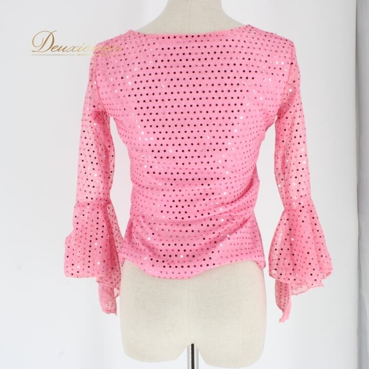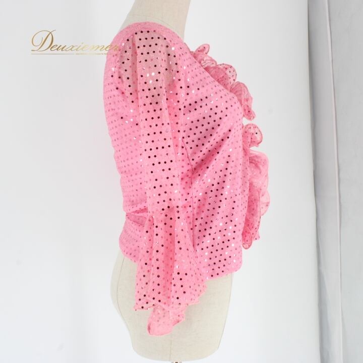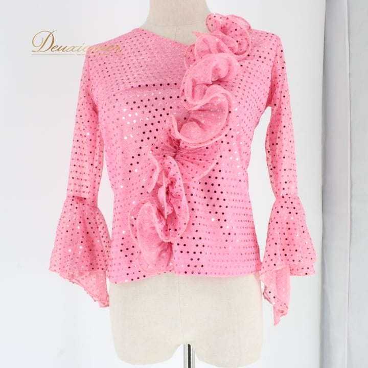 社交ダンス 衣装 スタンダード トップス レッスンウェア レディース 長袖 ピンク系 キラキラ ホログラム フリル かわいい 練習着 華やか 伸縮性 動きやすい おしゃれ パーティー レディースファッション スポーツウェア ダンス用 練習用 トップス 薄手 お洒落 トレーニング ウエア 上品 デザイン発表会 フレア シルエット ルームウェア