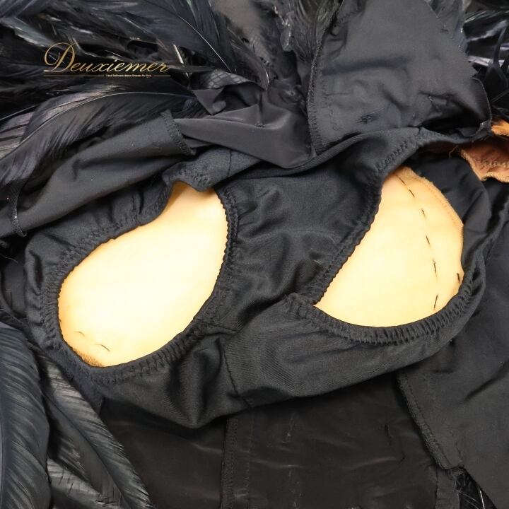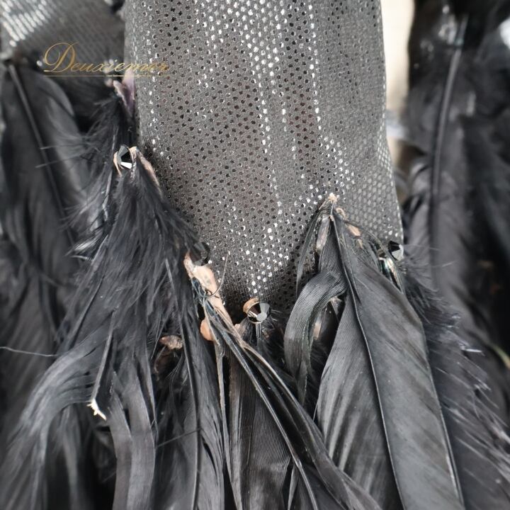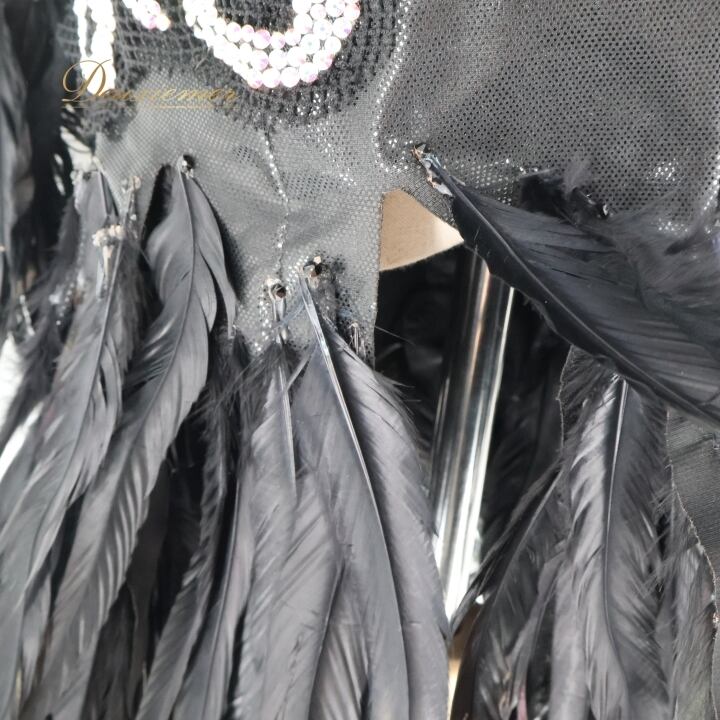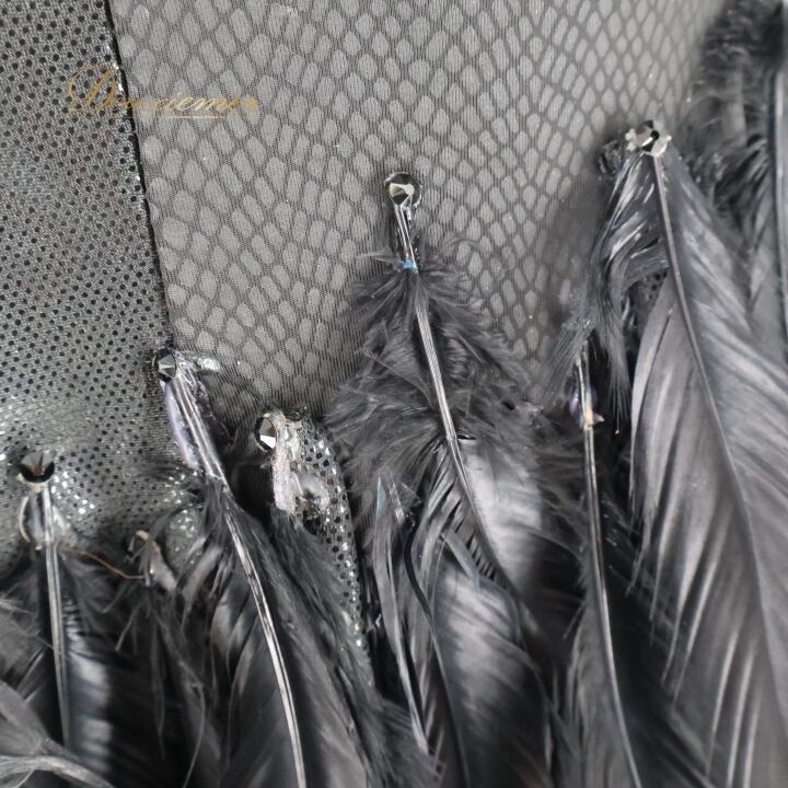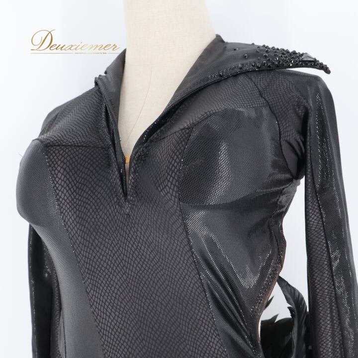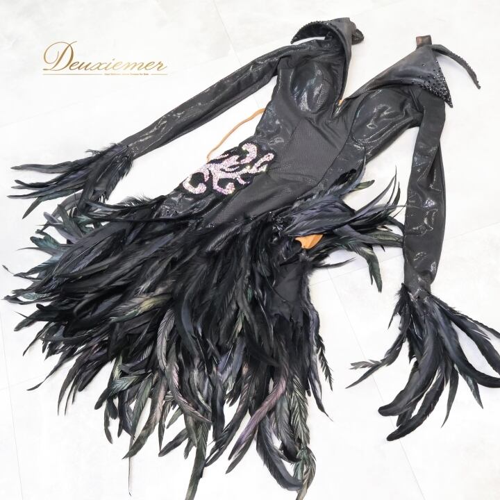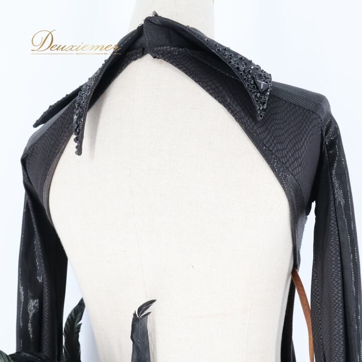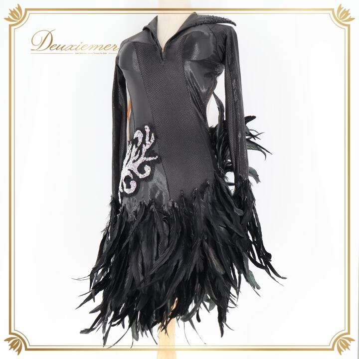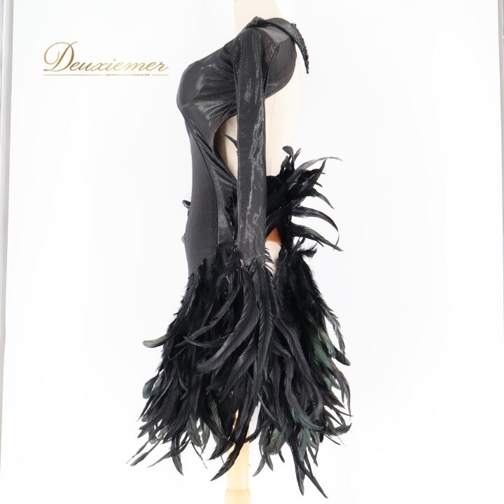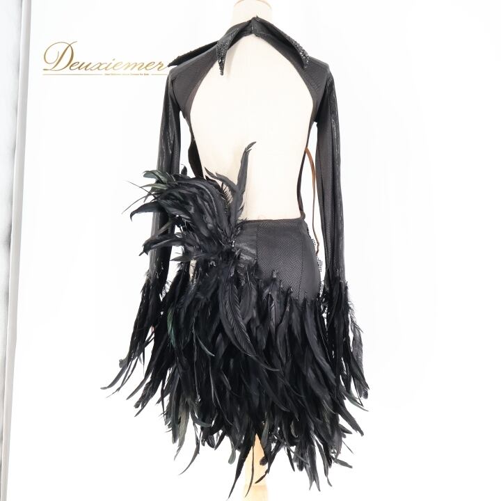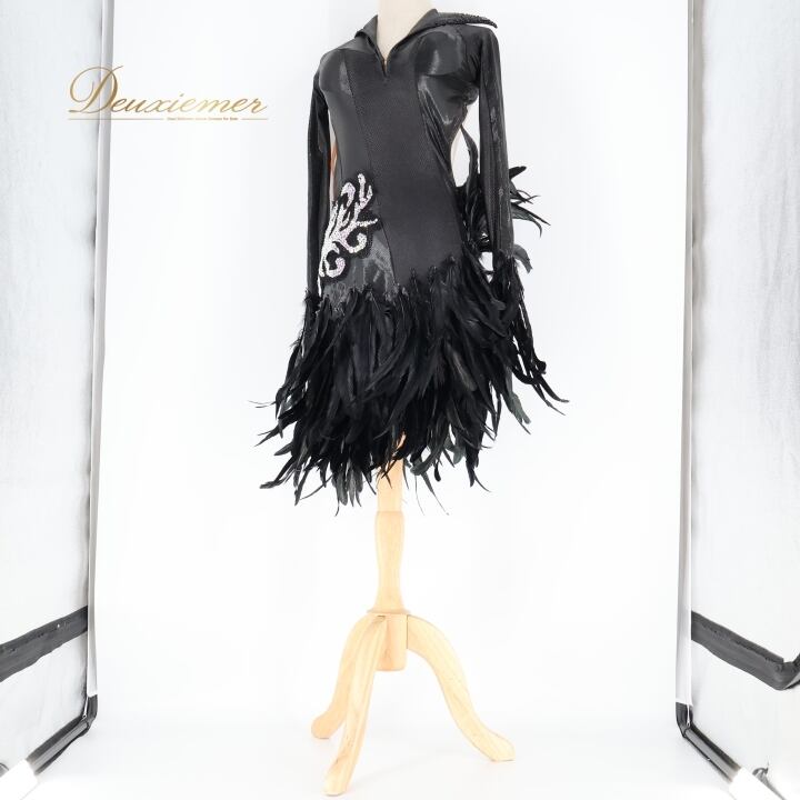 社交ダンス 衣装 ラテン ドレス ワンピース 黒 羽 デモ 競技 ダンス パーティ 発表会 襟 目立つ 個性的 特徴的 細身 ブラック系 コスチューム 豪華 レディース おしゃれ 目を引く 魅力的 派手