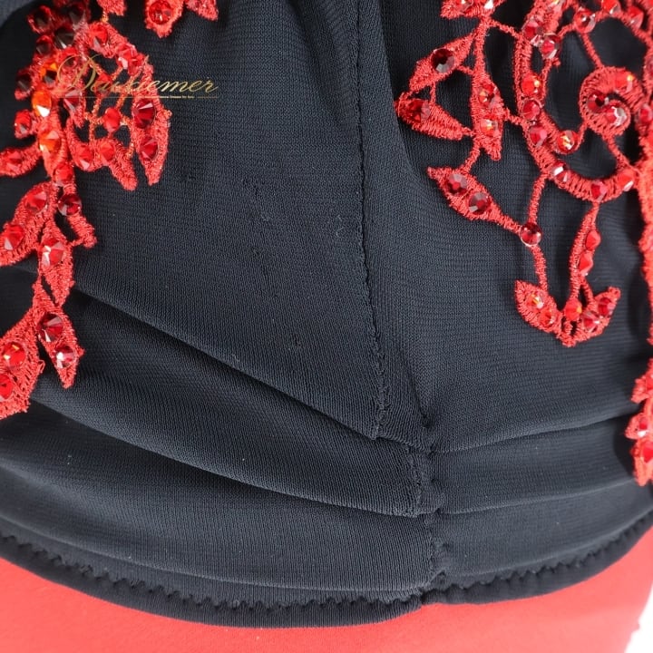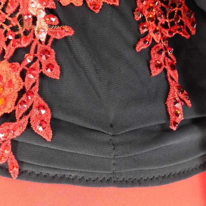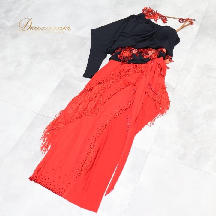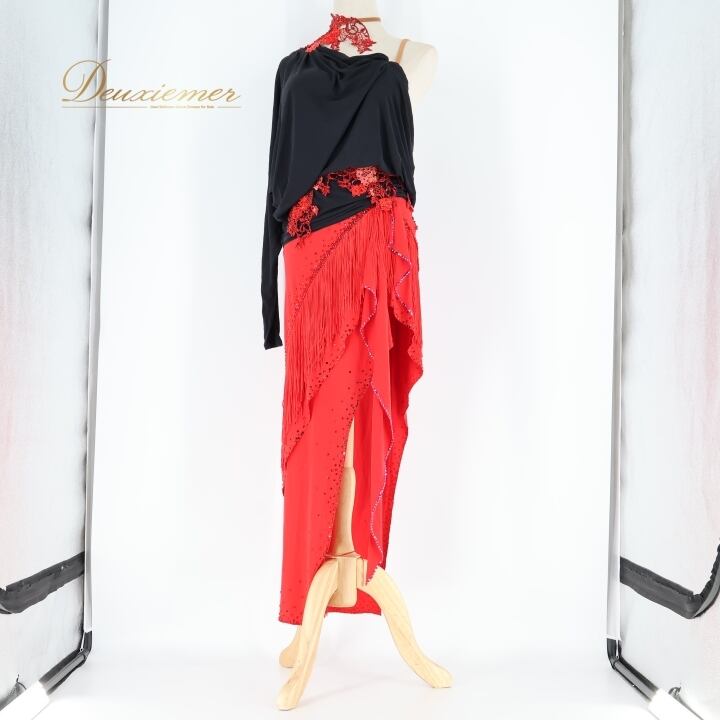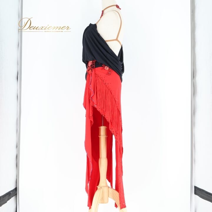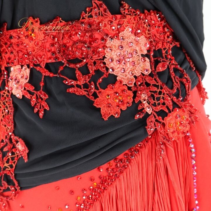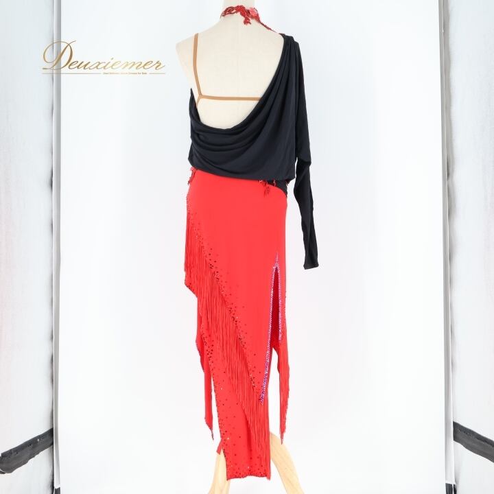 社交ダンス 衣装 ラテン ドレス ワンピース 黒 赤 デモ 競技 ダンス パーティ 発表会 レッド ブラック 装飾 伸縮 アシンメトリー ブラック系 レッド系 お洒落 フリンジ フェスティバル 競技会 パフォーマンス レディース