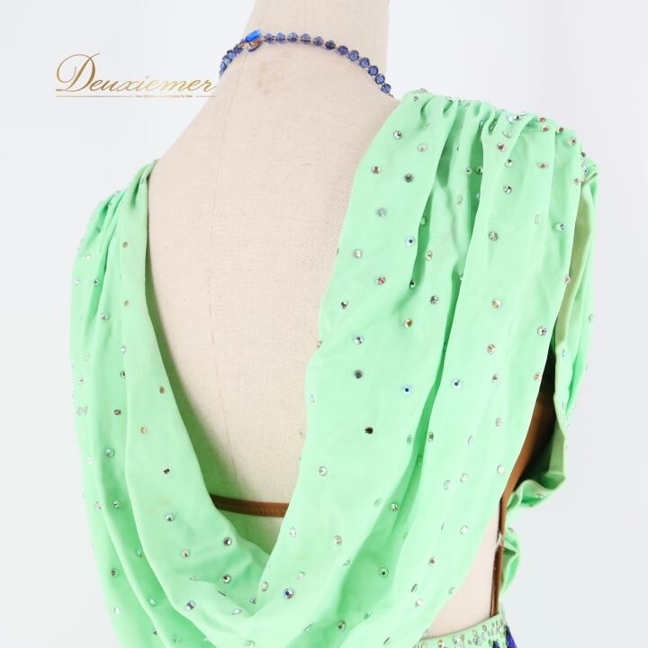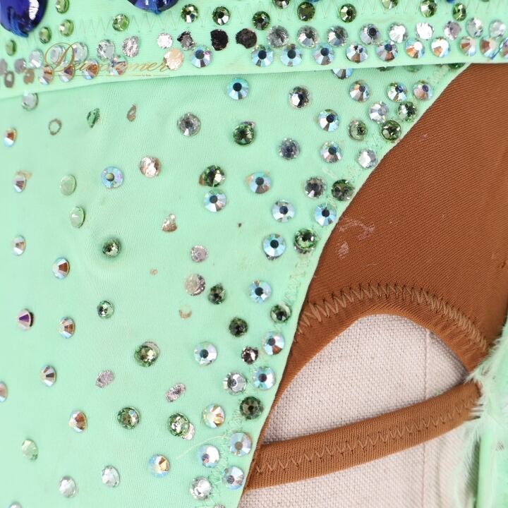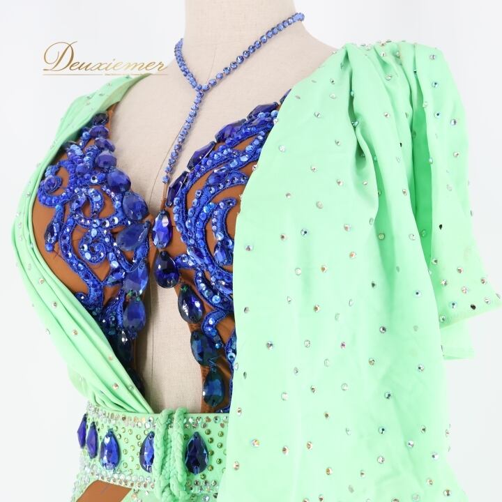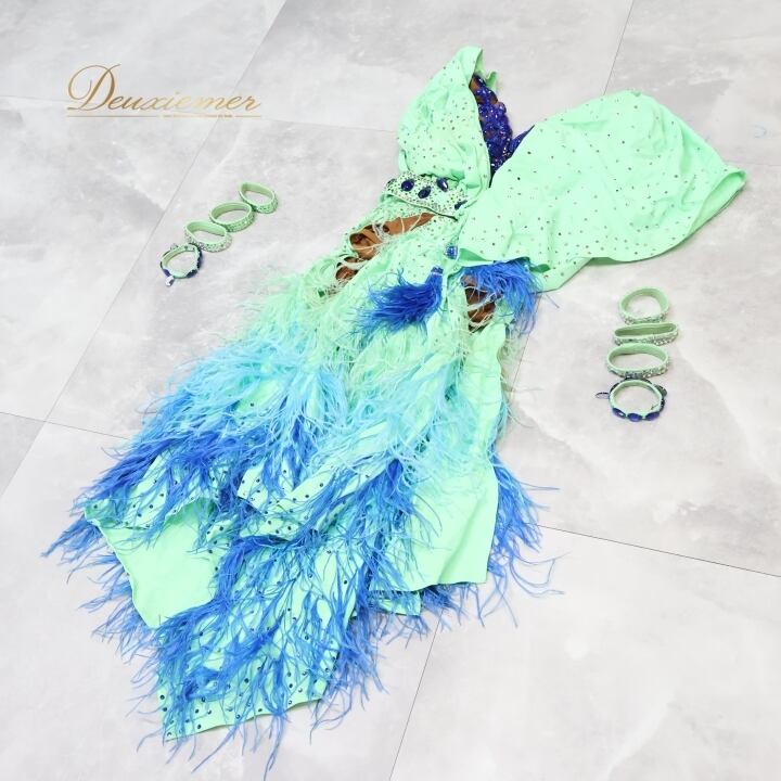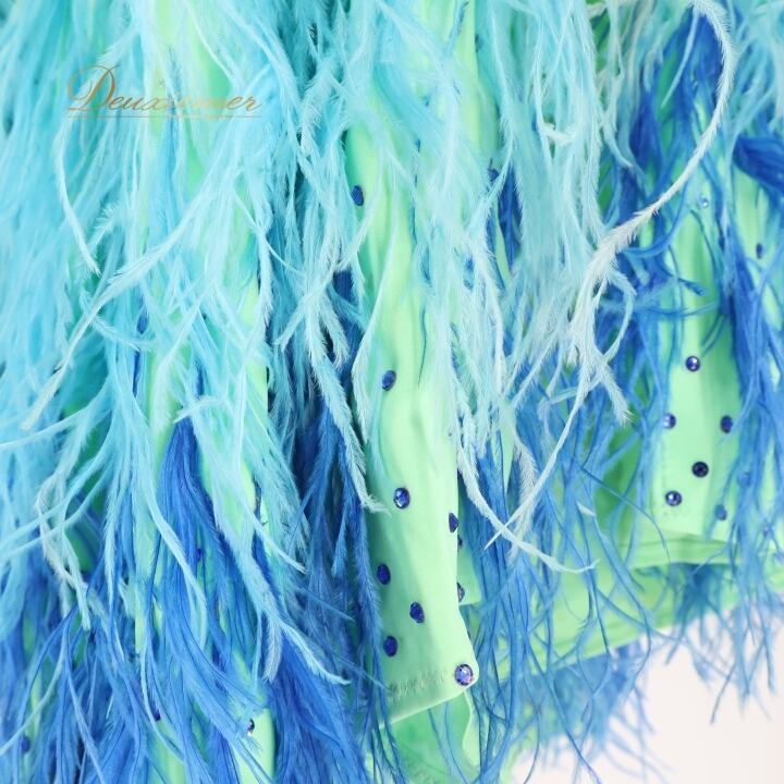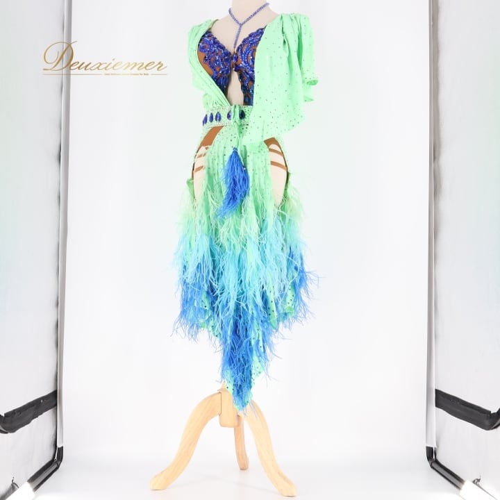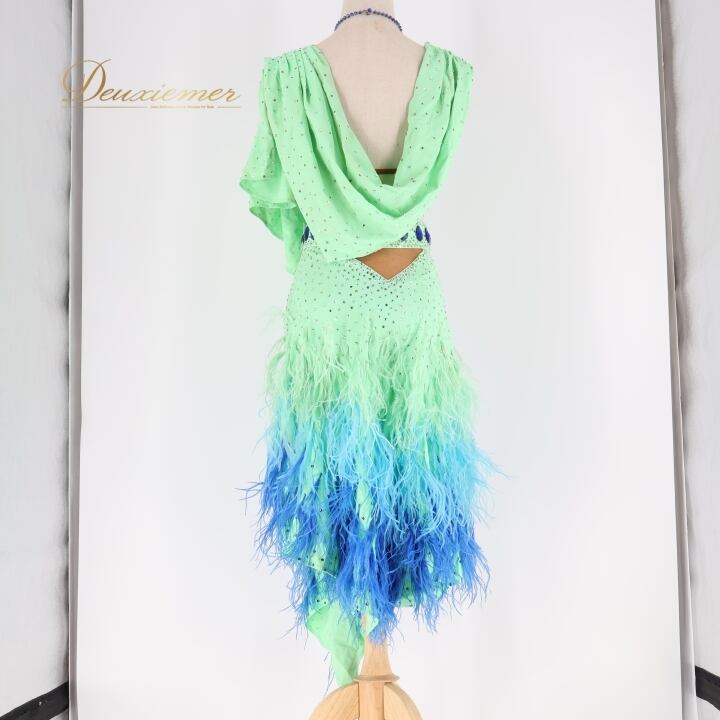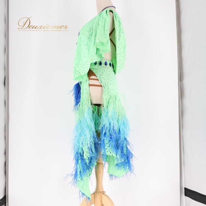 社交ダンス 衣装 ラテン ドレス ワンピース ファー デモ 競技 ダンス パーティ 発表会 青 緑 ミント 水色 羽 毛 グリーン系 ブルー系 豪華 デザイン さわやかな色 おしゃれ コンペティション 用 衣装 競技用 ラテンドレス フェザー スカート 美しい ステージ衣装