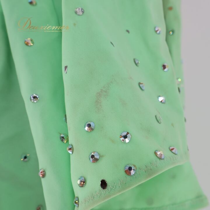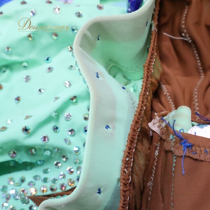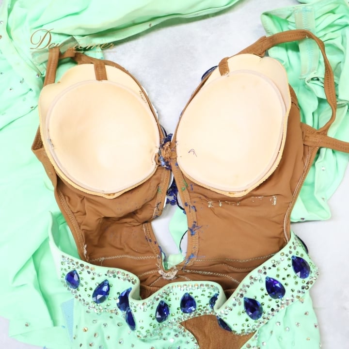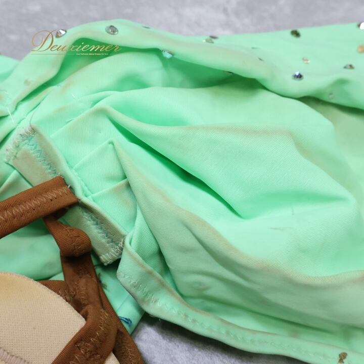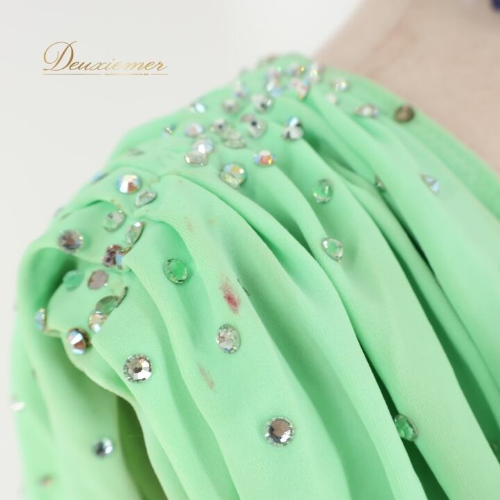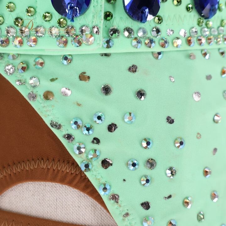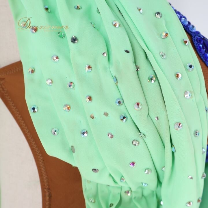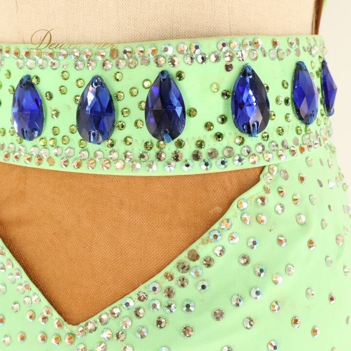 社交ダンス 衣装 ラテン ドレス ワンピース ファー デモ 競技 ダンス パーティ 発表会 青 緑 ミント 水色 羽 毛 グリーン系 ブルー系 豪華 デザイン さわやかな色 おしゃれ コンペティション 用 衣装 競技用 ラテンドレス フェザー スカート 美しい ステージ衣装