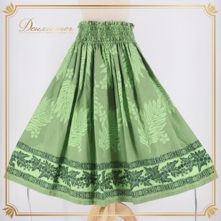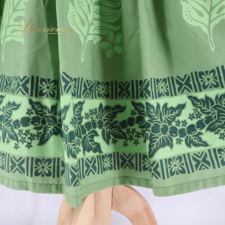 フラダンス 衣装 パウスカート マカマカ グリーン系 MakaMaka シングル シンプル ワントーン ラウアエ柄 プルメリア柄 かわいい 華やか 鮮やか 緑 ハワイアン アロハ ハワイアンプリント フラ ダンス レッスン 練習 おしゃれ ダンスウェア