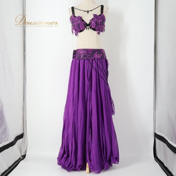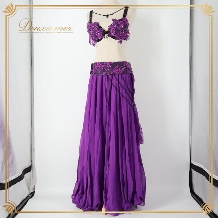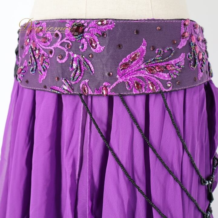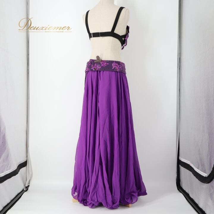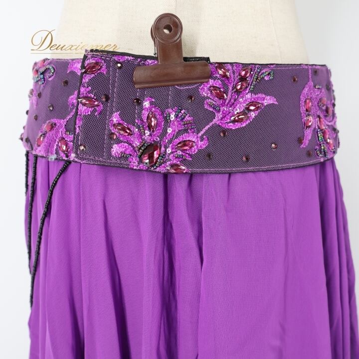ベリーダンス オリエンタル 衣装 上下セット パープル系 トップス スカート ベルト セット 紫 ラインストーン ビーズ 華やか 透け感 鮮やか ステージ イベント ダンス衣装 目立つ かわいい