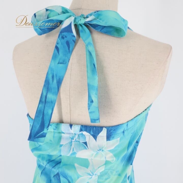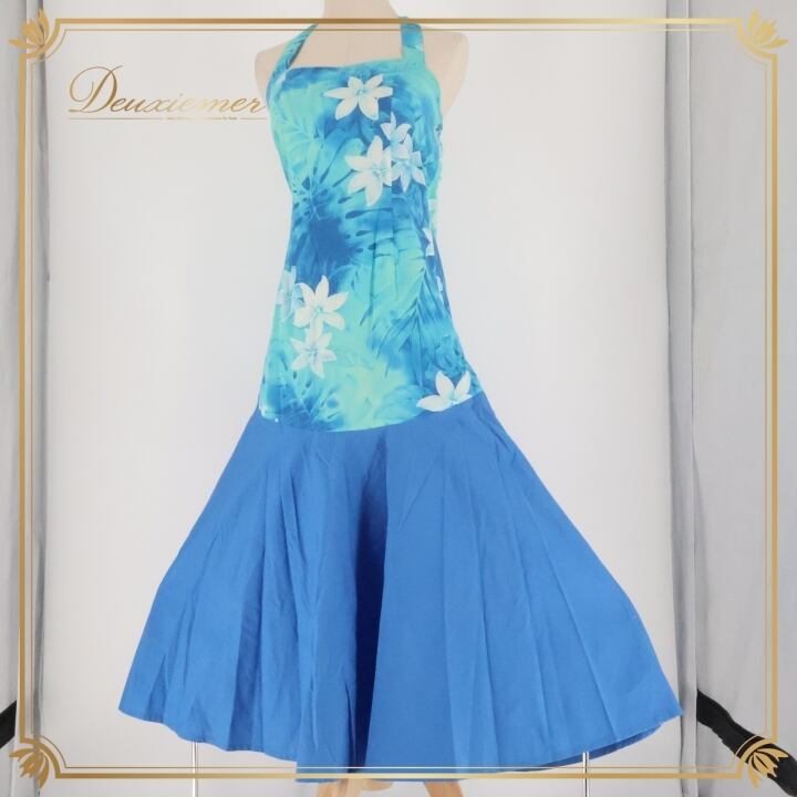 フラダンス 衣装 ワンピース ドレス マーメイドライン エムエムジェイ ブルー系 MermaidLine MMJ 日本製 ホルターネック ワントーン かわいい 華やか 鮮やか 明るい 青 ハワイアン アロハ ハワイアンプリント フラ ダンス レッスン 練習
