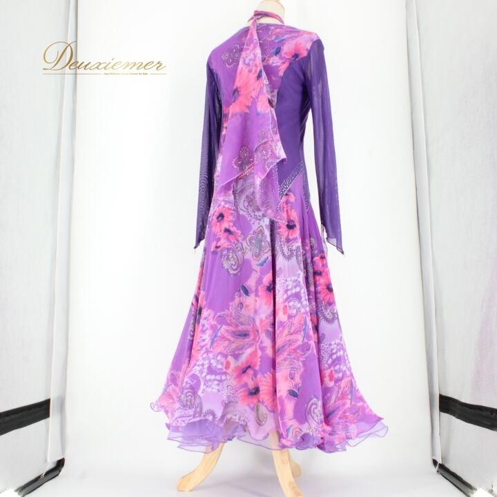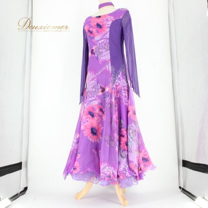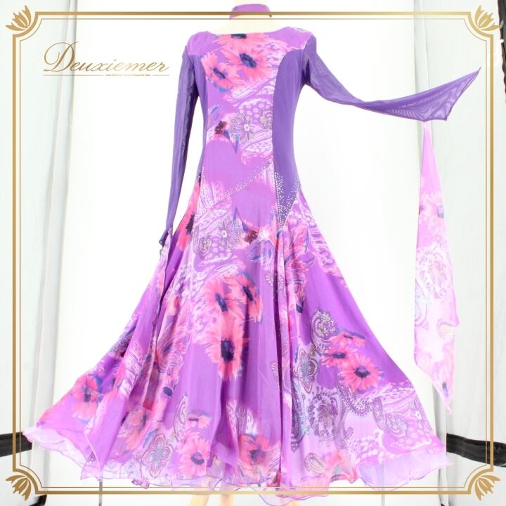 社交ダンス 衣装 スタンダード ドレス ワンピース パーティドレス ラインストーン ICHIOKU イチオク 紫 パープル系 フロート 長袖 花柄 社交ダンス衣装 パーティードレス 舞台衣装 光沢素材 二重スカート 軽やか シルエット ラインストーン付き フロートデザイン 機能性ドレス 可愛いデザイン 花柄プリント 衣装サイズ 美しいカラー ダンス用ドレス 華やか レディース 柔らかい素材 年齢問わず ディスコ衣装 競技用ドレス