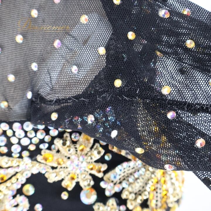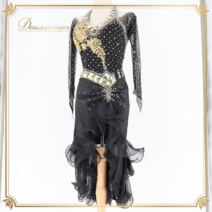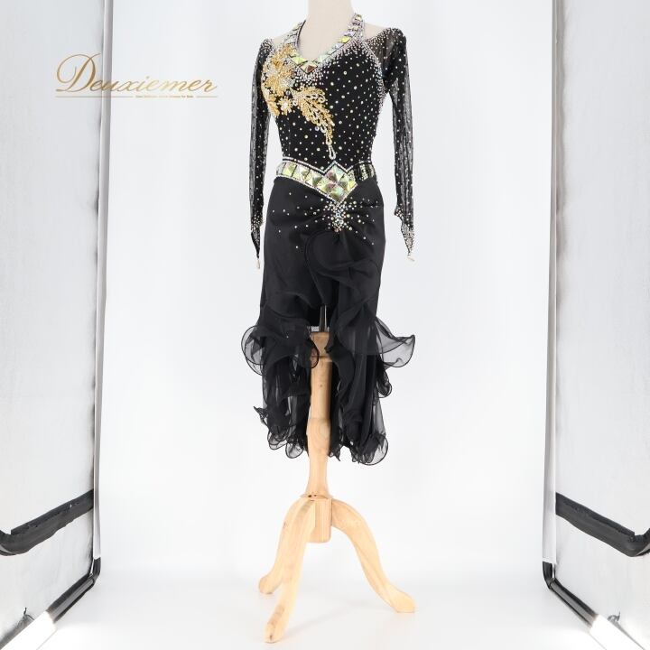 社交ダンス 衣装 ラテン ドレス ワンピース 黒 ゴールド 金 フリル レース 高級感 パーティ 発表会 デモ 競技 ダンス 上品 ブラック系 ゴールド系 おしゃれ フリル袖 輝き コンペティション エレガント