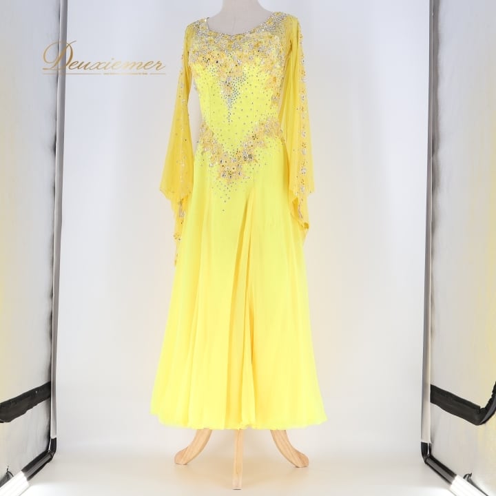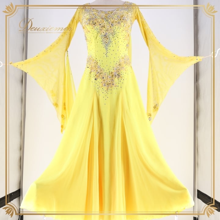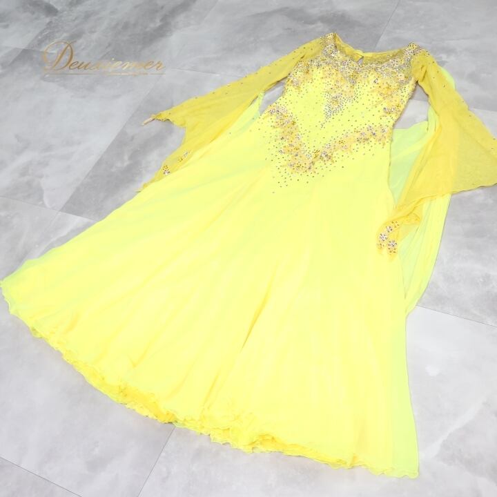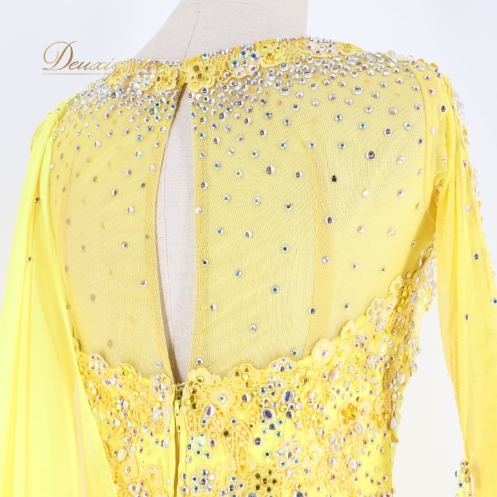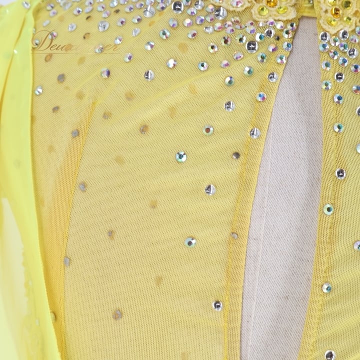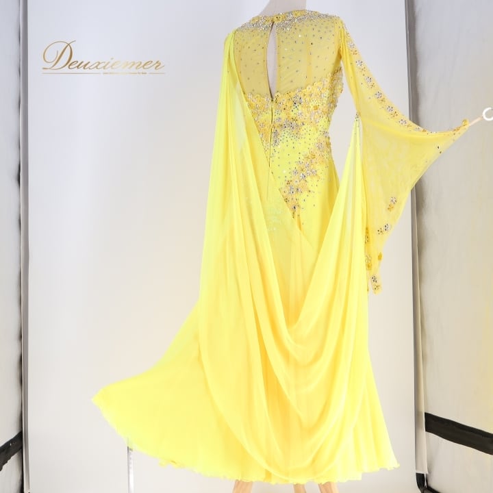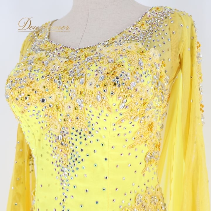 社交ダンス 衣装 スタンダードドレス ワンピース ドレス スタンダード 黄色 レース デモ 競技 ダンス パーティ 発表会 上品 綺麗 華やか イエロー系 フロート スカート 3枚重ね 落ち感 競技用 発表会用 ステージ衣装 ゴージャス コスチューム ロングドレス パーティー ショー