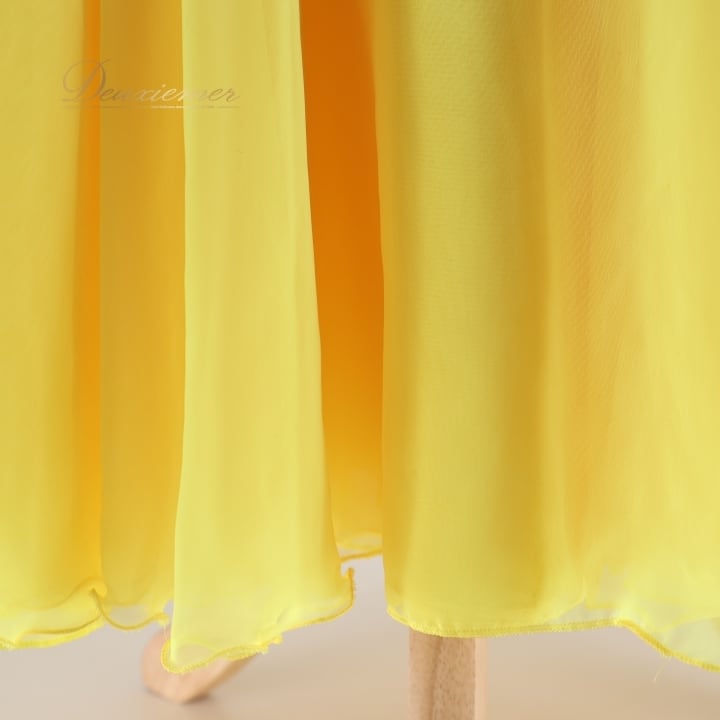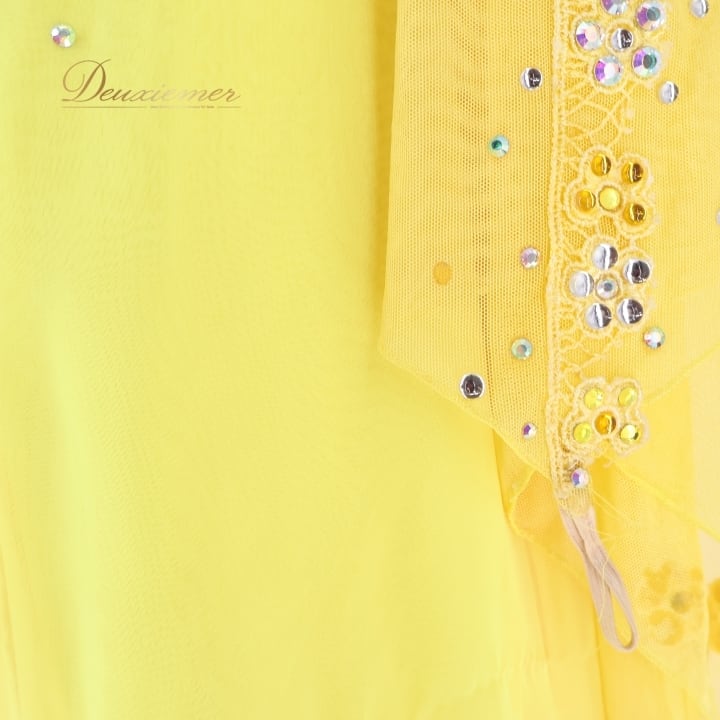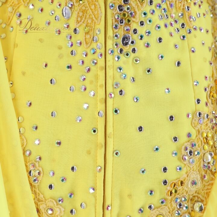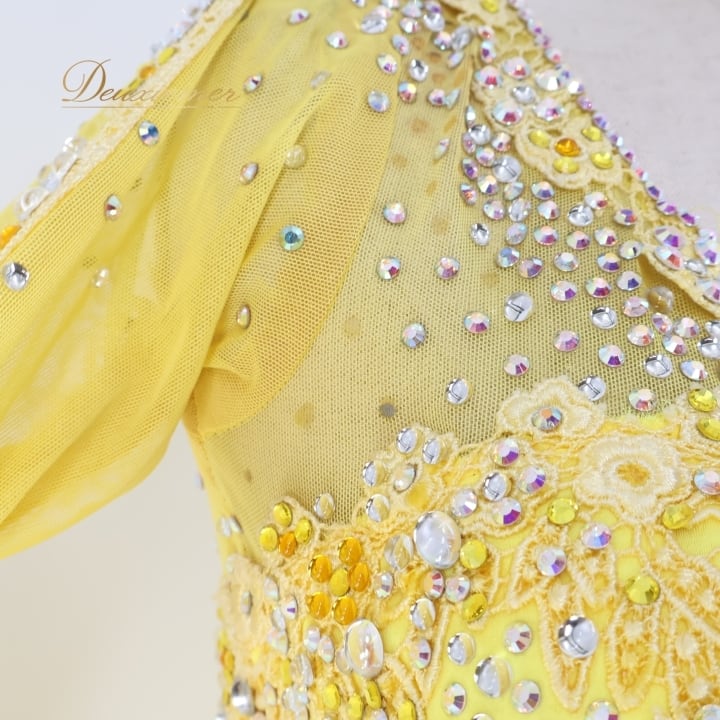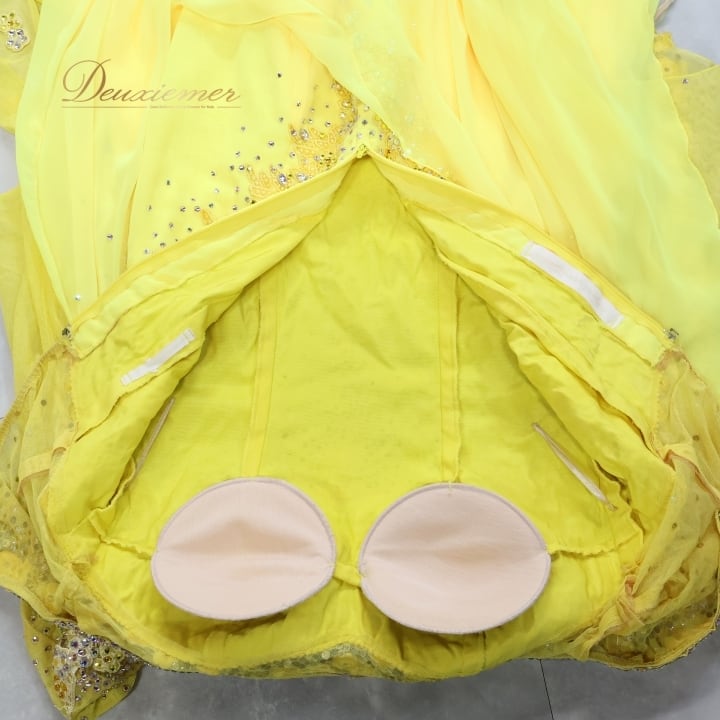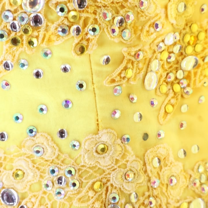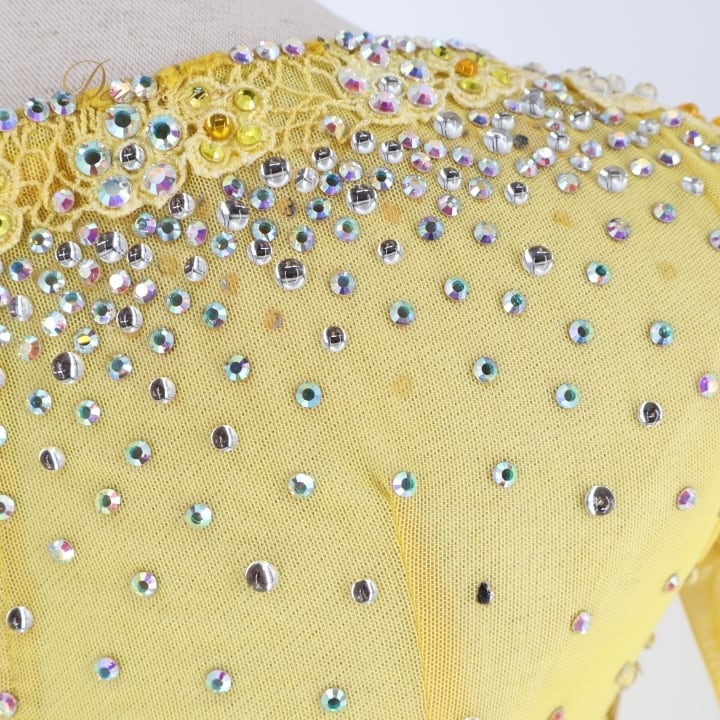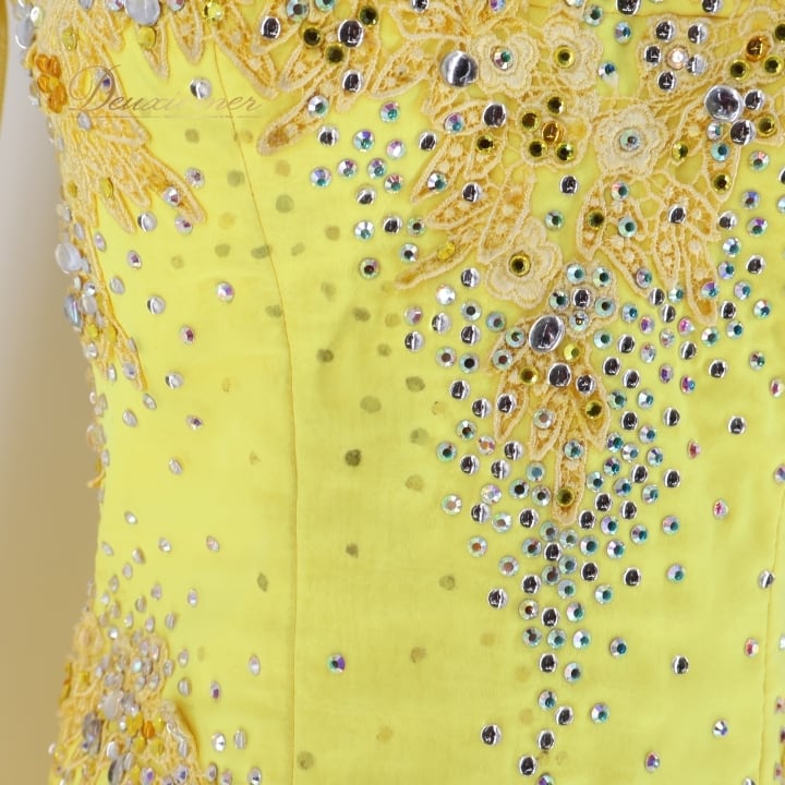 社交ダンス 衣装 スタンダードドレス ワンピース ドレス スタンダード 黄色 レース デモ 競技 ダンス パーティ 発表会 上品 綺麗 華やか イエロー系 フロート スカート 3枚重ね 落ち感 競技用 発表会用 ステージ衣装 ゴージャス コスチューム ロングドレス パーティー ショー