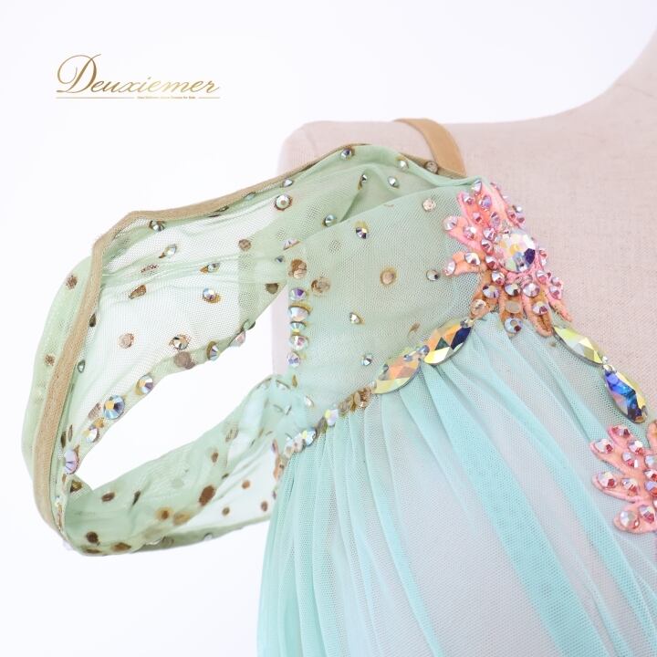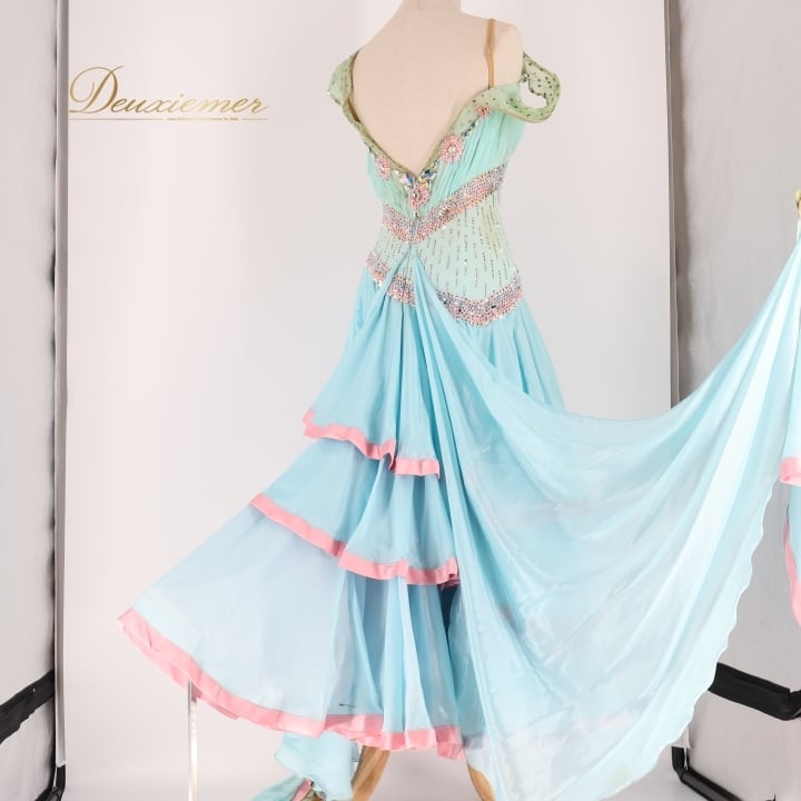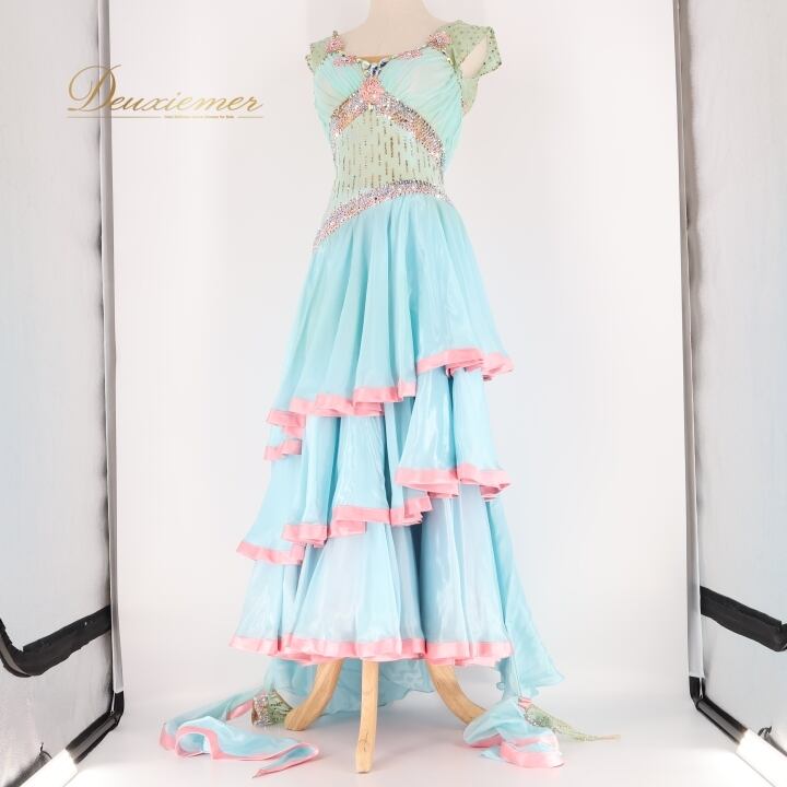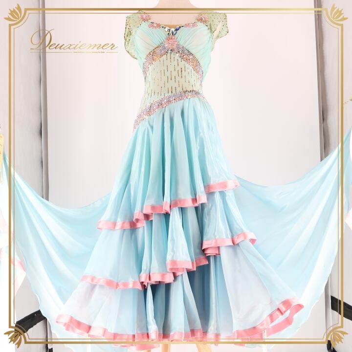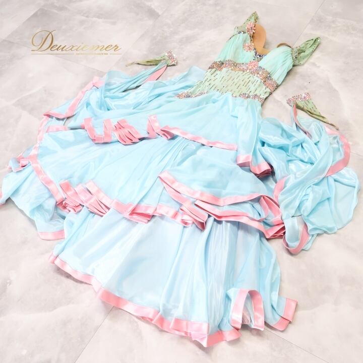 #社交ダンス #ダンス衣装 #ワンピース #ドレス #水色 #ピンク #かわいい #ファッション #舞台衣装 #パーティードレス #レオタード #背面ファスナー #伸縮性 #胸パッド #女性トルソー #ダンススタイル #衣装コーデ #スカート #重ねスカート #ENUTSU