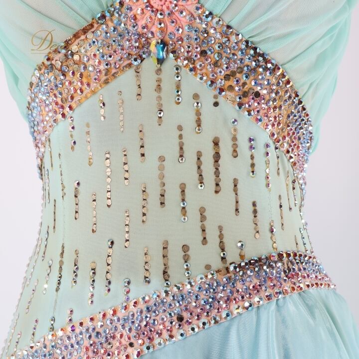 社交ダンス 衣装 ROBINHOOD ロビンフッド スタンダードドレス ワンピース ドレス 水色 ピンク フロート レース 明るい かわいい 艶 デモ 競技 ダンス パーティ 発表会 ブルー系 ピンク系 グリーン系 カラフル フェミニン 軽やか おしゃれ 女性用 ドレスアップ 発表会用 ステージ衣装