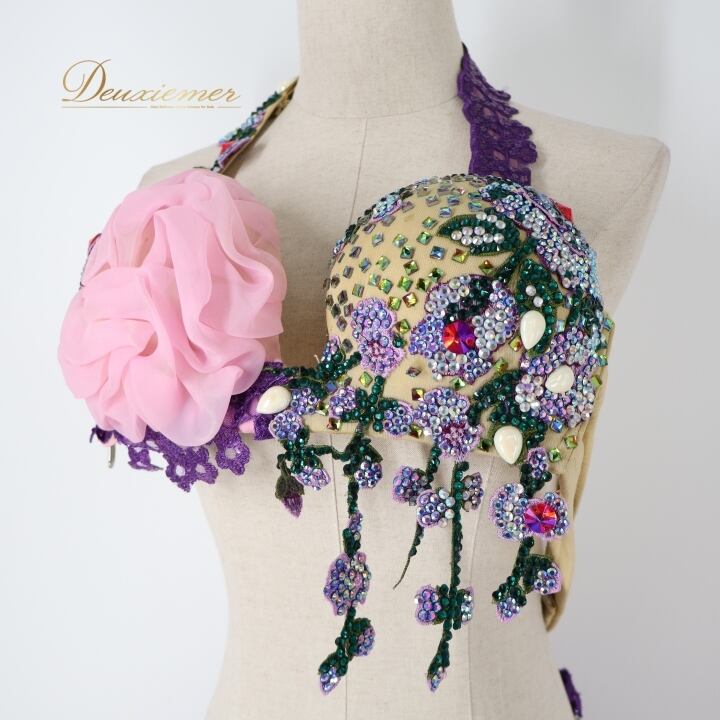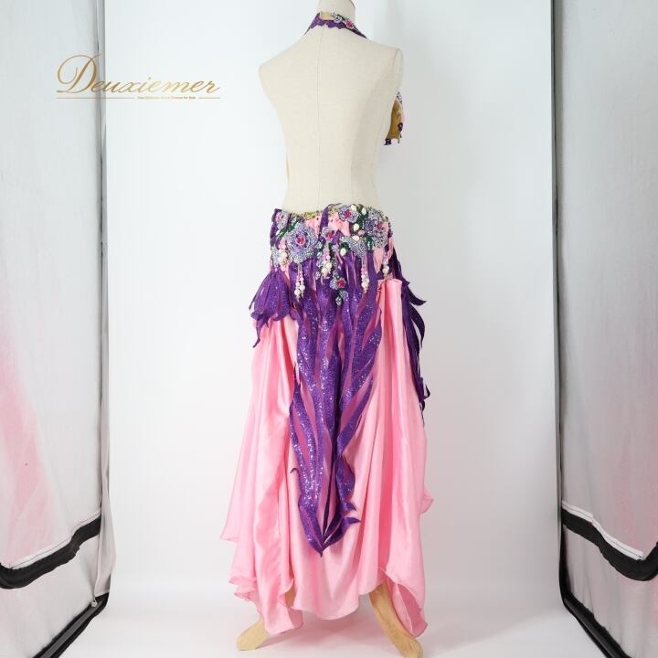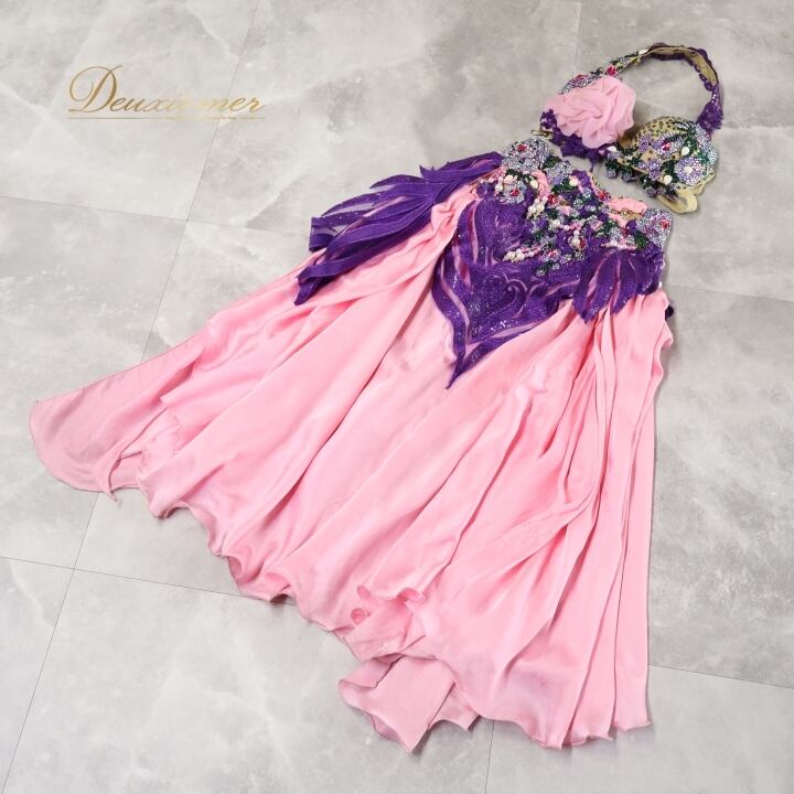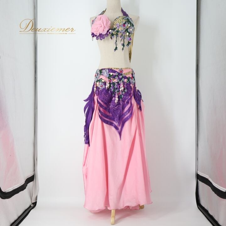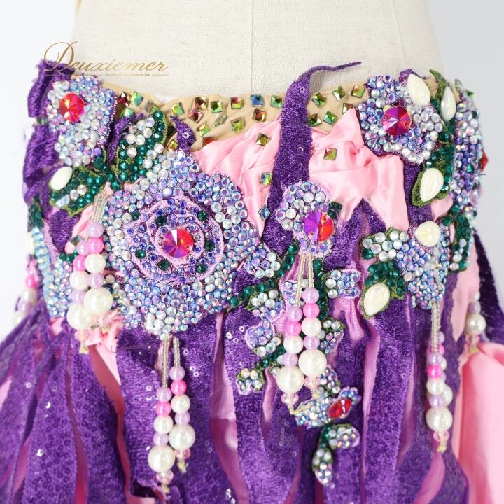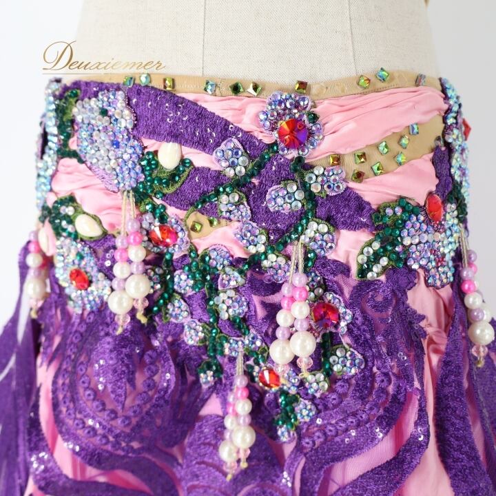 ベリーダンス オリエンタル 衣装 上下セット ピンク系 クイーン Queen トップス スカート 紫 緑 花 ラインストーン ビーズ 豪華 装飾 華やか かわいい エジプト製 イベント ステージ スリット ダンス衣装 パープル系 グリーン系