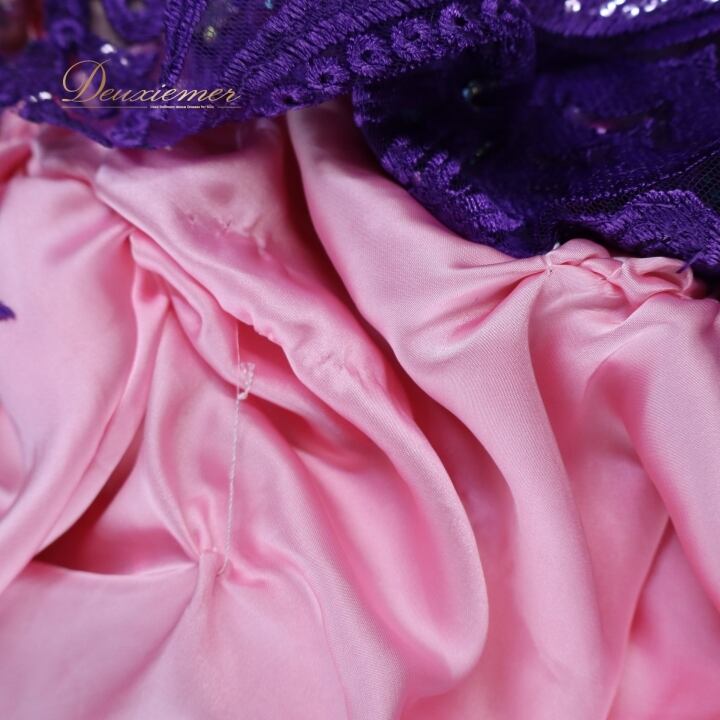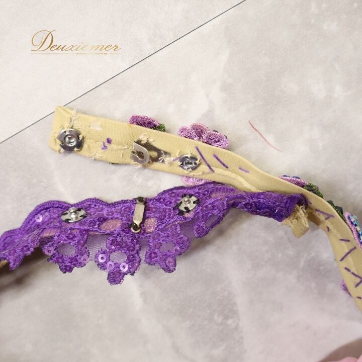 紫の生地全体的ヨレ有り。多数ほつれ、毛羽立ち有り。