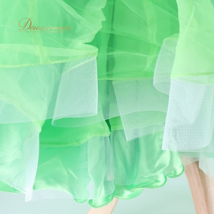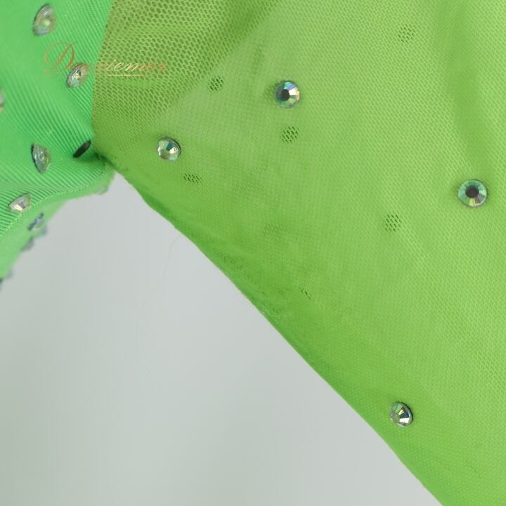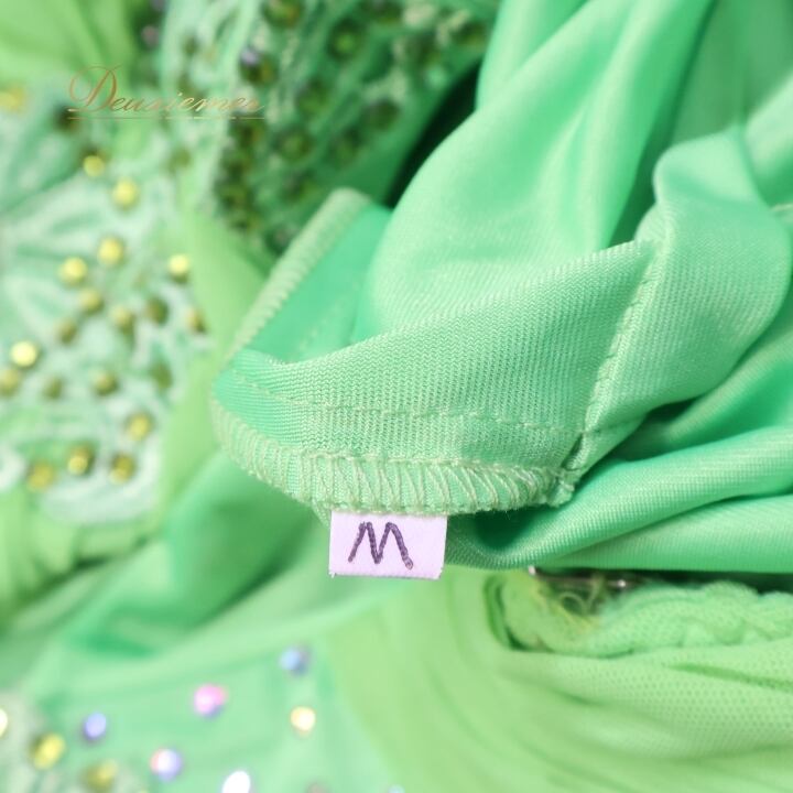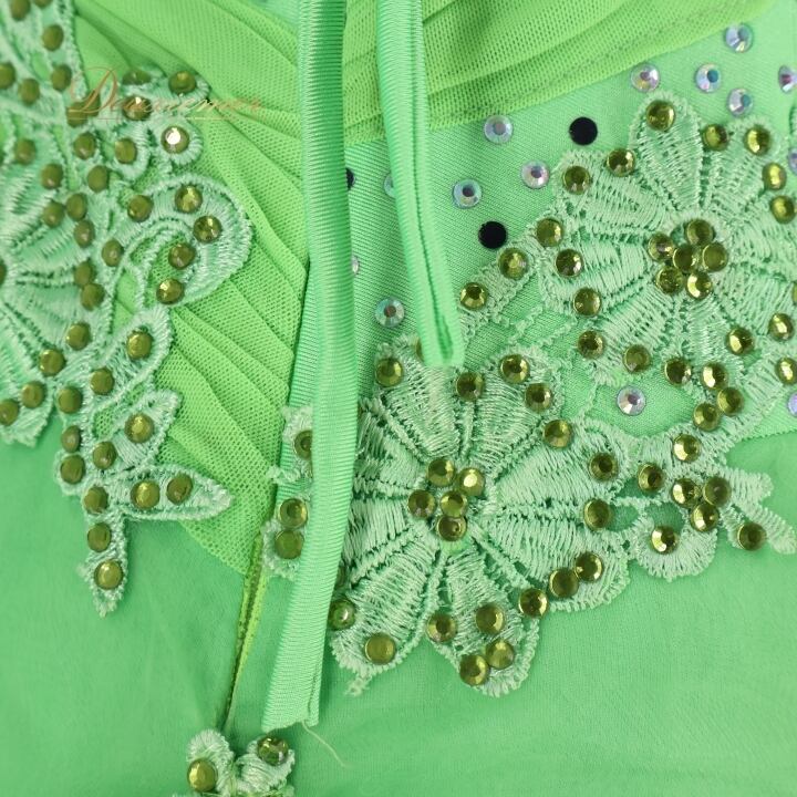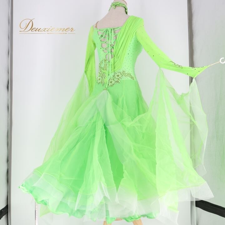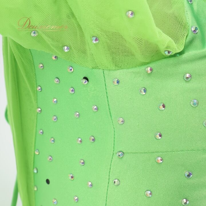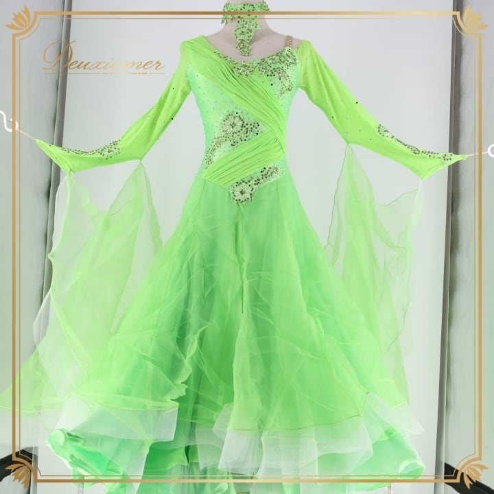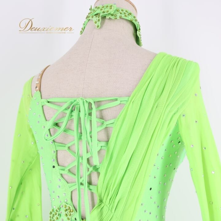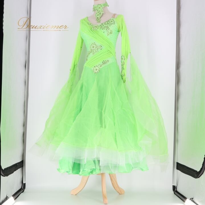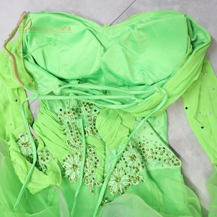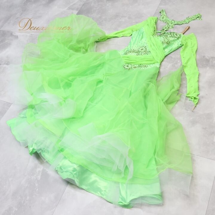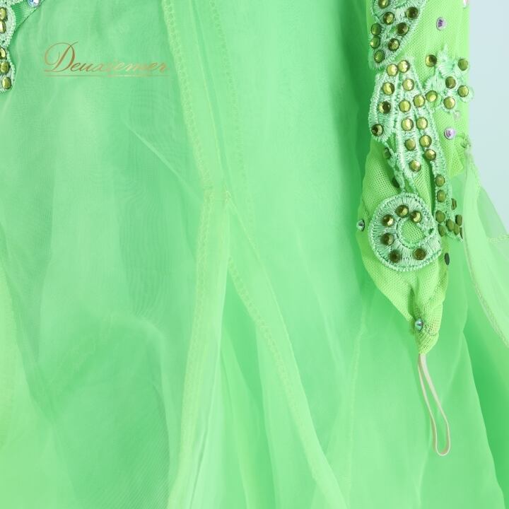 社交ダンス 衣装 スタンダードドレス ドレス ワンピース スタンダード フロート レース 蛍光 黄緑 緑 デモ 競技 ダンス パーティ 発表会 フリル レース グリーン系 おしゃれ 女性用 競技用 ドレスアップ 発表会用 蛍光カラー ステージ衣装