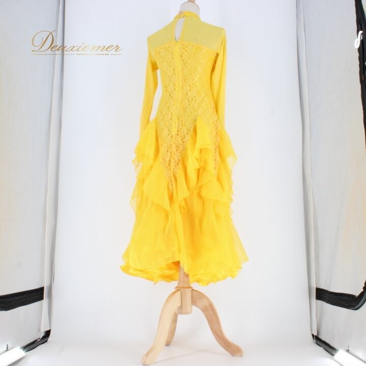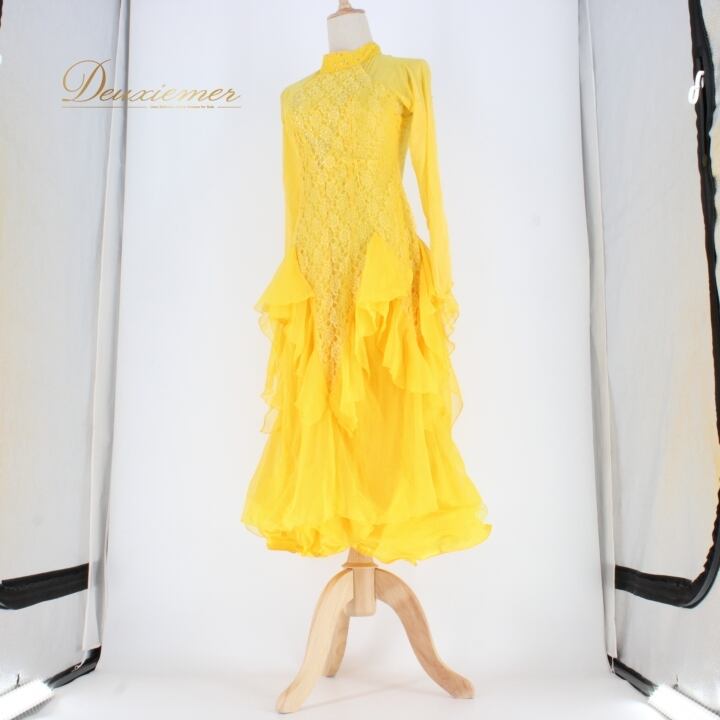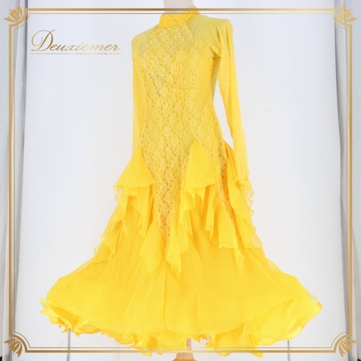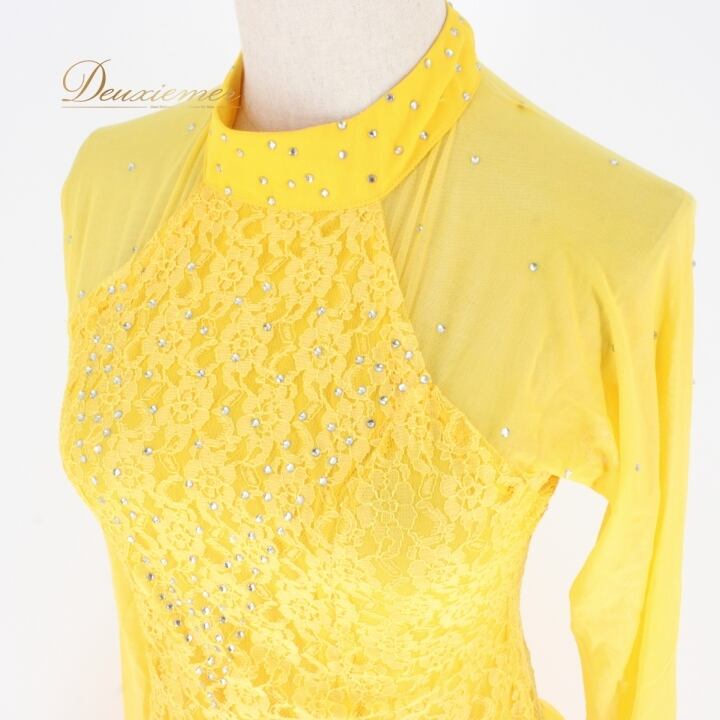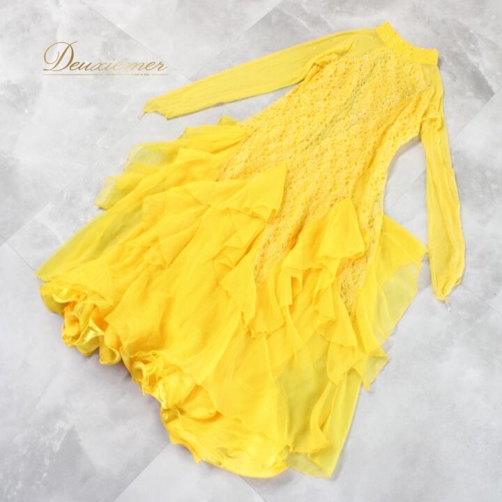 #社交ダンス #ダンス衣装 #ドレス #イエロー #花柄 #レース #ラインストーン #ファスナー #伸縮性 #パーティードレス #オシャレ #女性用 #ダンスファッション #ビビッドカラー #洗練されたデザイン #アクティブ #スタイリッシュ #特別な日のために #ダンスパフォーマンス #ENUTSU
