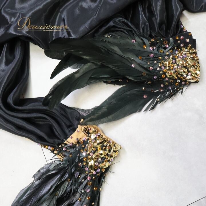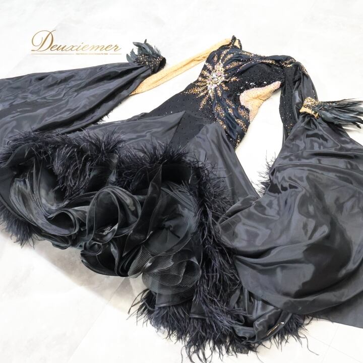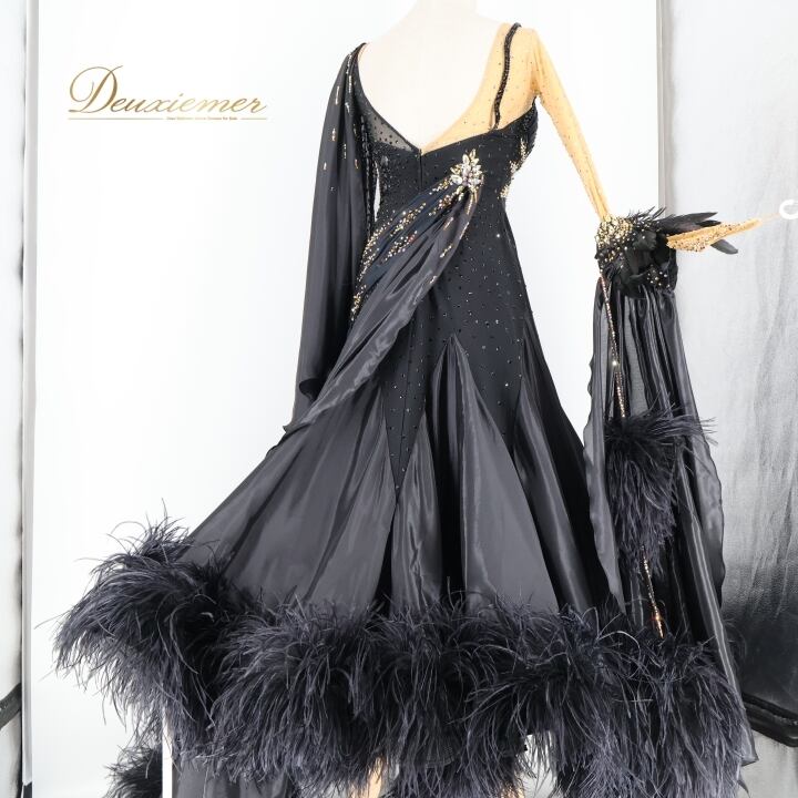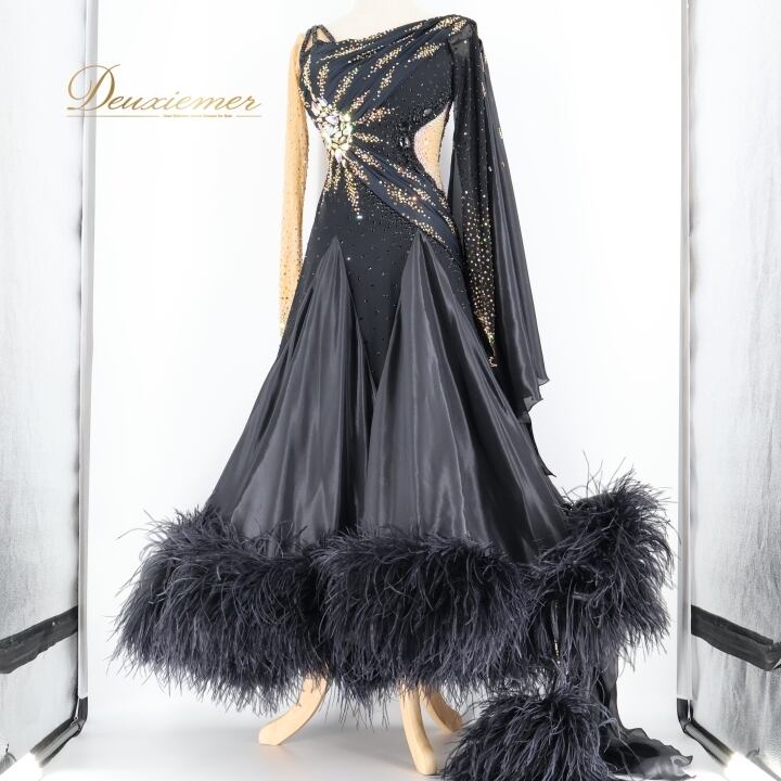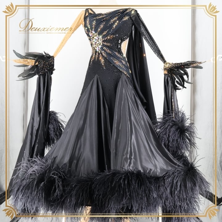 社交ダンス 衣装 スタンダードドレス ワンピース ドレス フロート レース 黒 羽 ファー デモ 競技 ダンス パーティ 発表会 高級感 上品 ゴージャス ブラック系 ゴールド系 高級ドレス フォーマルドレス ダンス衣装 ファー付き 羽付き ブラックドレス ゴールド装飾 競技用ドレス パーティー衣装 発表会用ドレス 豪華デザイン