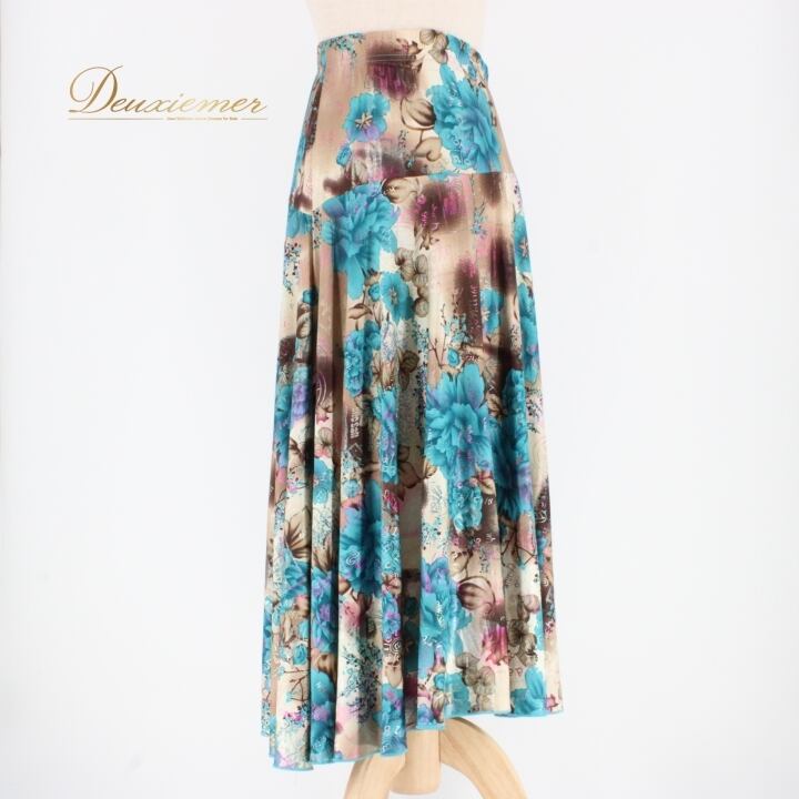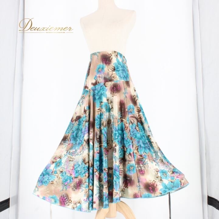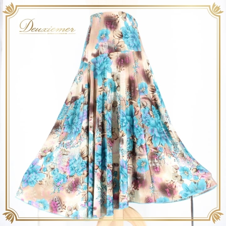#社交ダンス #ダンス衣装 #ダンススカート #花柄 #ブルー #ブラウン #オフホワイト #女性用 #ストレッチ #ウエストゴム #ポリエステル #ファッション #ダンスファッション #ダンススタイル #衣装デザイン #スカートスタイル #トルソー #可愛い #上品 #エレガント #ENUTSU