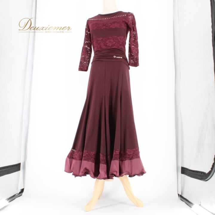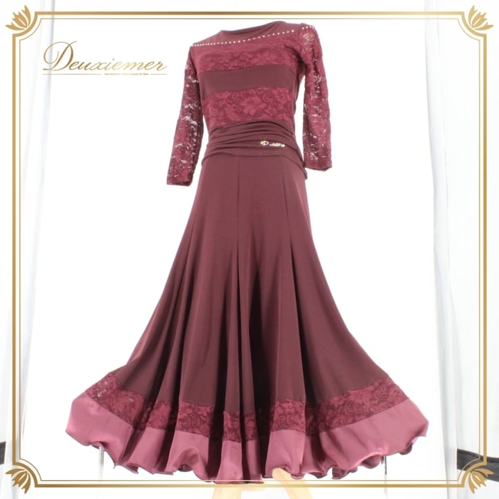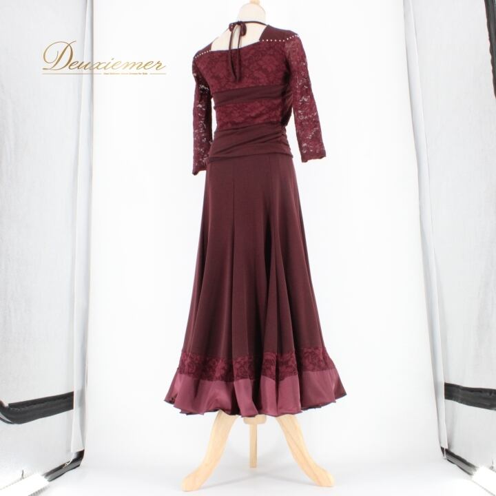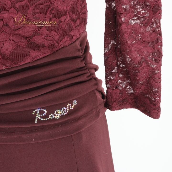 社交ダンス 衣装 スタンダード 上下セット ツーピース レッスンウェア パーティ衣装 Roger バーガンディ レース ラインストーン 派手 花柄 バーガンディ系 スカート 二重スカート ボリューム 優雅 動き 花柄レース しっとり 厚手 伸縮性 パーティー服 女性用 大人用 ダンスウエア 競技用 社交ダンス衣装 おしゃれ 体型カバー