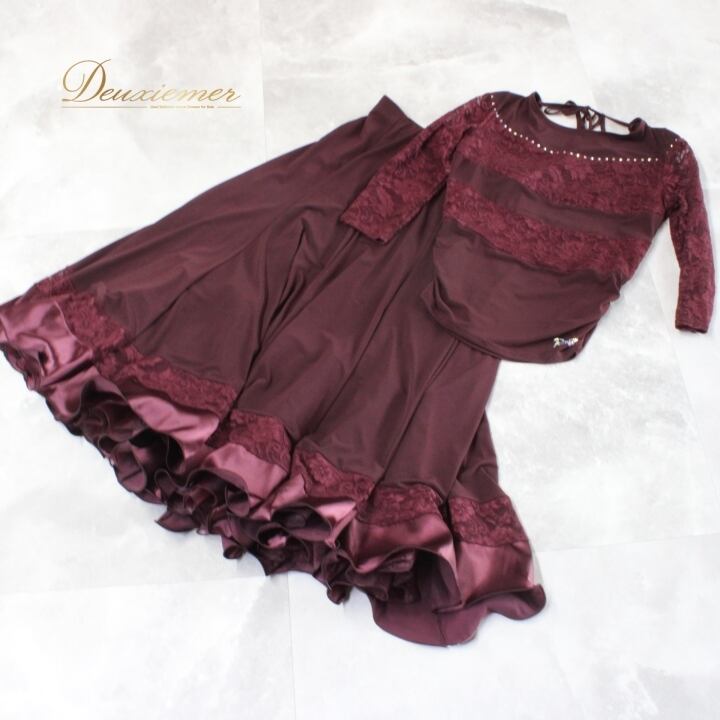 #社交ダンス #ダンス衣装 #女性用衣装 #バーガンディ #花柄 #レース #セットアップ #ダンスファッション #アクティブウェア #優雅 #ラインストーン #ストレッチ素材 #ウエストゴム #二重スカート #ボリューム感 #ダンススタイル #パフォーマンスウェア #おしゃれ #スタイルアップ #ENUTSU