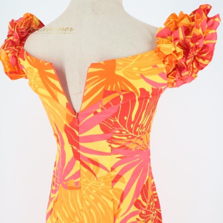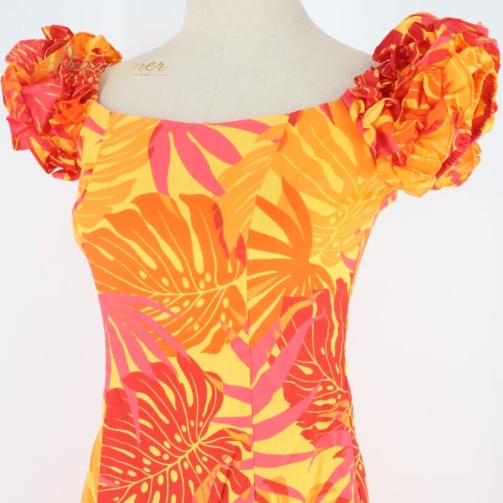 フラダンス 衣装 ワンピース ドレス オレンジ系 ワントーン フリル ノースリーブ モンステラ柄 かわいい 華やか 鮮やか 明るい 統一感 橙 赤 ハワイアン アロハ ハワイアンプリント フラ ダンス レッスン 練習 アシンメトリー パーティー レディース
