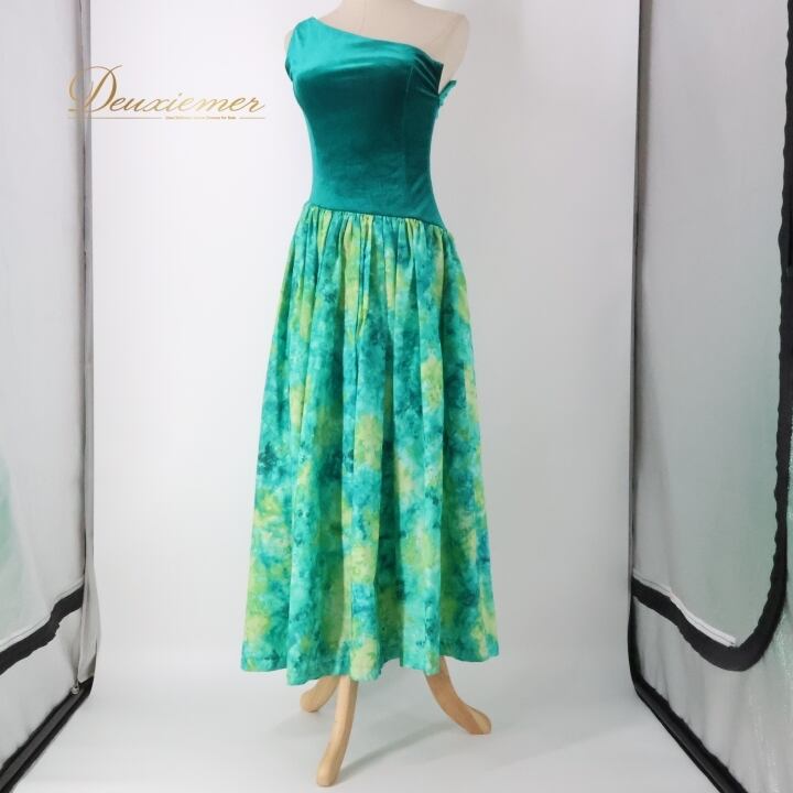 フラダンス 衣装 ワンピース ドレス グリーン系 ワンショルダー ベロア ワントーン かわいい 華やか 鮮やか 上品 高級感 光沢感 きれい 明るい 緑 ハワイアン アロハ ハワイアンプリント フラ ダンス レッスン 練習 ドレスアップ おしゃれ エレガント